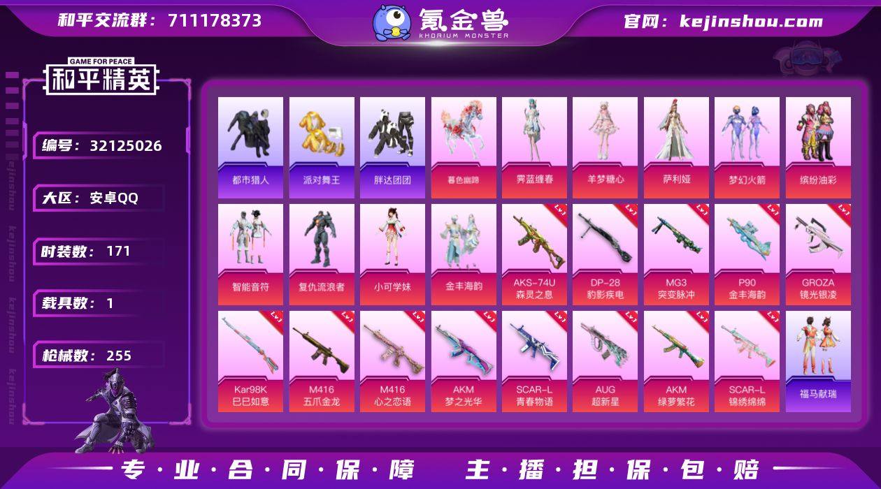 【连体号金鞋都市男神M4五爪金龙心之恋语15特效枪9粉装1载具素材号 送王者1无双1珍品12传说 秒换绑不用等】 安卓Q区-79029热力值-171套装-255枪皮 【1载具】 暮色幽蹄【3稀有】 都市猎人 派对舞王(金靴子) 派对舞王【9粉装】 梦幻火箭 缤纷油彩(猪脸妹) 复仇流浪者 霁蓝缠春 小可学妹 智能音符 角色-萨利娅 角色-羊梦糖心 金丰海韵【15特效枪】 M416-五爪金龙(6级) M416-心之恋语(1级) AKM-梦之光华(5级) AKS-74U-森灵之息(5级) Mk14-福马献瑞(3级) ACE32-萌骑漫游(2级) SCAR-L-青春物语(4级) SCAR-L-锦绣绵绵(5级) AUG-超新星(7级) AKM-绿萝繁花(5级) P90-金丰海韵(5级) MG3-突变脉冲(5级) Kar98K-巳巳如意(5级) GROZA-镜光银凌(5级) DP-28-豹影疾电(5级)【265热门】 浪漫天命 鹰眼刺客 破蛋小黄鸡 激萌罗小黑 迅捷狂鲨 深海小丑鱼 军刀雅典娜 胖达团团 英勇保护者 暗影哥特(红眼罩) 忍者信条 狂沙舞者 白色伏地魔 SS27特训 SS26特训 SS25特训 SS24特训 SS23特训 SS22特训 AKM-缤纷海域 AKM-环太平洋 SCAR-L-玉兔迎春 AUG-幻影战神 M762-天降萌叽 Mk47-乌木金纹 UMP45-蓝色火焰 DBS-彩虹符号 M249-彩虹符号 MG3-幻世战舞者 AKM-虎虎生威 AKM-霓虹街区 M416-蓝色火焰 GROZA-彩虹符号 长空猛禽 弄潮海豚 夏日倾情 燃烧卡路里 青涩时光 懵萌河马 魅力单车 六六大吉 蓝色运动 拉斐尔 漫步者 红色运动 海岛探路者 纯真浪花 春日漫步 M24-奇异狩猎者 AKM-奇异狩猎者 M762-奇异狩猎者 AA12-G-雨过天青 沙漠之鹰-雨过天青 情公主 平底锅-画境星梦 超感刻度 P90-紫矿核心 GROZA-紫矿核心 米开朗基罗 AWM-暮色玫影 M16A4-雨过天青 SPAS-12-福马献瑞 M249-无面战甲 雨过天青 冰河战士