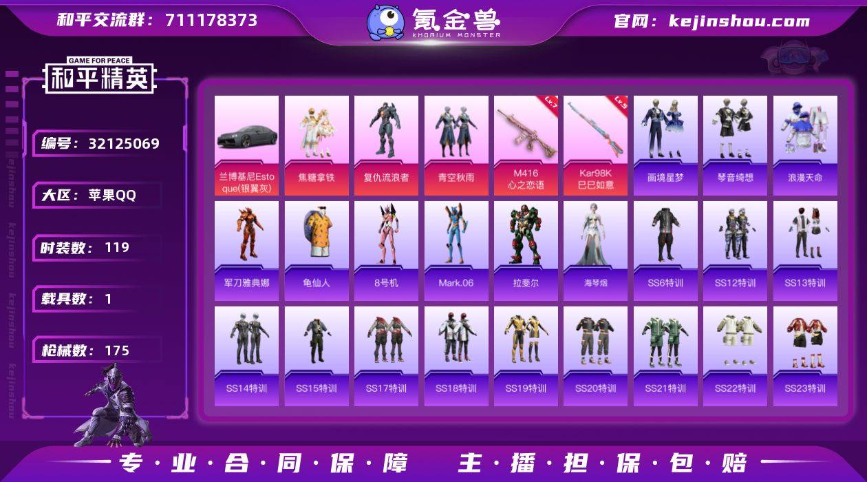 苹果 手Q-3粉装-4特效枪-1载具-0粉色飞行器-53532热力值-5王牌印记-119套装-175枪皮【热门品类】:套装-浪漫天命,角色-军刀雅典娜,套装-龟仙人,角色-8号机,角色-Mark.06【粉色套装】:粉装-焦糖拿铁,角色-复仇流浪者,粉装-青空秋雨【粉色枪皮等级】:M416-心之恋语(七级),Kar98K-巳巳如意(五级),Mk14-福马献瑞(一级),PKM-萌骑夺宝(五级)【粉色载具】:兰博基尼Estoque(银翼灰)【粉色枪皮】:M416-心之恋语,Kar98K-巳巳如意,Mk14-福马献瑞,PKM-萌骑夺宝【粉色降落伞】:焦糖拿铁降落伞,恐龙拽拽降落伞,筑梦精灵降落伞,环太平洋降落伞,垂柳戏鸭降落伞,初号机 觉醒Ver.降落伞【稀有套装】:套装-龟仙人,套装-马上有钱,角色-拉斐尔,角色-海琴烟,套装-画境星梦,套装-琴音绮想,套装-雨过天青,套装-红釉青花【稀有枪皮】:AKM-夜灯,AKM-彩虹符号,AKM-恐龙拽拽,AKM-春暖花开,AKM-灼热熔岩,AKM-环太平洋,AKM-生命誓言,AKM-破晓战魂,AKM-萌趣颜团子,AKM-虎虎生威,AKM-龙的传人,M16A4-幻世战舞者,M16A4-甜心亚梦,M16A4-生命誓言,M16A4-红色方程式,M16A4-蓝色火焰,SCAR-L-暗夜玫瑰,SCAR-L-炫彩节奏,SCAR-L-玉兔迎春,SCAR-L-红色方程式,SCAR-L-致命红樱,M416-夜灯,M416-月影鸳鸯,M416-红色方程式,M416-绯红前夜,M416-绿野极光,M416-蓝色火焰,GROZA-异彩先驱,GROZA-懵萌河马,GROZA-生命誓言,GROZA-田园牧歌,AUG-耀粉歌者,QBZ-原初圣火,QBZ-彩虹符号,QBZ-飞驰魅影,M762-奇异狩猎者,M762-牛气冲天,M762-瑞龙福将,M762-绯红前夜,M762-镭射皇者,Mk47-天之羽翼,G36C-懵萌河马,AC-VAL-天降萌叽,AC-VAL-甜心亚梦,AC-VAL-魅影蝠王,蜜獾-天降萌叽,蜜獾-娇憨猪猪,ACE32-画境星梦,UZI-啾咪啾咪,UZI-娇憨猪猪,UZI-炫彩节奏,UZI-红色方程式,UMP45-生命誓言,U...