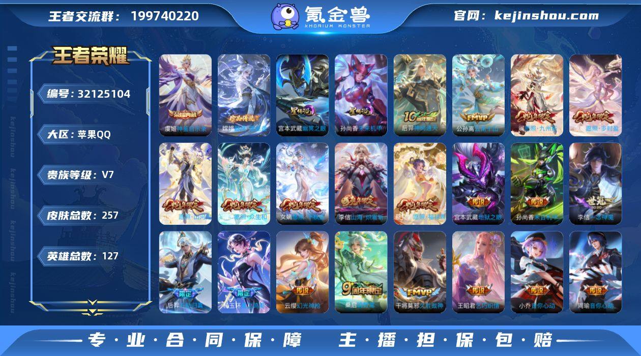 苹果Q-V7-至尊星耀IV段位-127英雄-257皮肤-1典藏皮肤-1珍品传说-20传说-68史诗【英雄全皮】:司空震全皮,空空儿全皮【荣耀典藏】:虞姬神鉴启示录【珍品传说】:嫦娥器灵落星盏【传说皮肤】:后羿神树通天,公孙离云诺千山,杨玉环星之鸣奏,后羿千劫归真,司空震愿照山河定,女娲愿照千秋盛,妲己愿照众生和,澜愿照九州拓,蔡文姬愿照福禄聚,虞姬愿照岁时盈,云缨幻光神枪,桑启鸣野蒿,李信山海炽霜斩,王昭君乞巧织情,周瑜音你心动,小乔音你心动,李信一念神魔,干将莫邪久胜战神,孙尚香末日机甲,宫本武藏地狱之眼【限定皮肤】:蒙犽顽岩魄,蔡文姬夏日便利店,大乔绒语心约,虞姬夏日便利店,姜子牙天穹之誓,杨戬破阵退雄兵,狄仁杰阴阳师,赵云皇家上将,孙尚香蔷薇恋人,吕布御风骁将,元歌无心,马可波罗暗影游猎,狄仁杰魔术师,项羽海滩派对,兰陵王金庭之子,李元芳云中旅人,钟馗驱傩正仪,女娲朔望之晖,干将莫邪胡桃夹子,苏烈千军破阵,沈梦溪大漠名商,裴擒虎李小龙,裴擒虎擒涛扼浪,云中君纤云弄巧,李信山海炽霜斩,嫦娥拒霜思,鲁班大师探海日志,盘古冰霜神祇,桑启海盐诗旅,艾琳流音漫舞,司空震地狱燃心,阿古朵江河有灵,张良古海寻踪,蒙犽百解令,妲己灵卜魔法,鬼谷子天穹祈灯,沈梦溪龙舞盛年,鲁班七号蔬乡物语,李元芳蔬乡物语,刘邦剑破天穹,程咬金群星魔术团,芈月浮光幕影,周瑜熔金海岸【年限皮肤】:吕布御风骁将,李信山海炽霜斩,司空震愿照山河定,女娲愿照千秋盛,妲己愿照众生和,澜愿照九州拓,蔡文姬愿照福禄聚,虞姬愿照岁时盈【赛季限定】:钟馗驱傩正仪,苏烈千军破阵,兰陵王金庭之子,沈梦溪大漠名商,李元芳云中旅人,桑启海盐诗旅,裴擒虎擒涛扼浪,鲁班大师探海日志,张良古海寻踪,鬼谷子天穹祈灯,刘邦剑破天穹,姜子牙天穹之誓,东皇太一噬灭天穹...