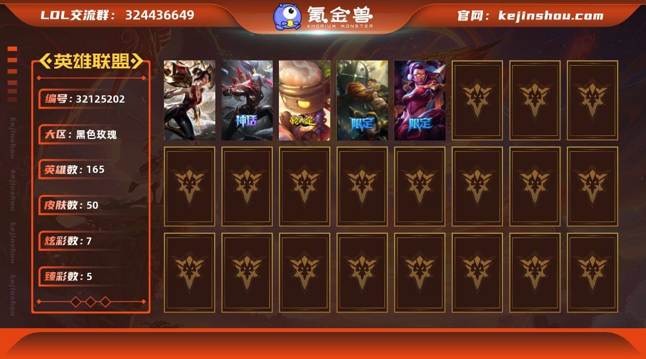 青铜段位-165英雄-50皮肤-7炫彩-0终极-1神话-6限定-3传说-10史诗【神话皮肤】:殿堂传奇薇恩【卓越皮肤】:殿堂传奇卡莎【臻彩皮肤】:赵云子龙炫金将军,征服者阿利斯塔炫金,泳池派对辛德拉荔枝枝连击,霸天巨兽雪崩墨菲特【年限皮肤】:点心宝贝阿木木,龙马烈焰波比【限定皮肤】:Fnatic古拉加斯,SKTT1薇恩,暗裔英雄盖伦【传说皮肤】:合金巨兽努努和威朗普,屠龙勇士潘森,西部魔影大小姐蕾欧娜【史诗皮肤】:法国皇室厄运小姐,百夫长贾克斯,炼金狂士辛吉德,暗星嘉文四世,冰川勇者伊泽瑞尔,死亡领主莫德凯撒,骸骨之爪希瓦娜,奥术大师吉格斯,暗黑女武神黛安娜,源计划雷卢锡安【其他皮肤1】:小红帽安妮,幽蓝梦魇加里奥,幻执事乐芙兰,联合王国费德提克,沙之守护瑞兹,神龙尊者苍龙艾希,梦魇泰达米尔,遗迹守护者基兰,北风冻原图奇,情绪摇滚阿木木,泳池派对蒙多,老兵普朗克,银河魔装机神伊莉丝,黑色玫瑰假面舞会伊莉丝,小蜜蜂奥莉安娜,武力全开乌迪尔,美酒节特使古拉加斯,KDAALLOUT阿卡丽,虚空执事玛尔扎哈,血色精锐泰隆,青花瓷拉克丝,KDA阿狸,坚韧不屈沃利贝尔,初号机维克托,双城之战杰斯,灵之菊纳尔,妖怪艺术家妮蔻,怨之砂派克,灵能特工派克