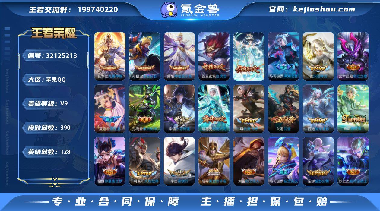 QY1379 苹果QQ/尊贵铂金/390皮肤/128英雄/3典藏/0珍品无双/0无双/0珍品传说/27传说/116史诗/9稀有英雄 【3 典藏皮肤】全息碎影 孙悟空,神鉴启示录 虞姬,九霄神辉 花木兰, 【27 传说皮肤】武圣 关羽,启明星使 虞姬,云霓雀翎 虞姬,白虎志 百里玄策,云鹰飞将 曜,深海之息 马可波罗,游龙清影 西施,诗剑行 李白,灼幽烈阳 东皇太一,浮生妄 夏洛特,猫影幻舞 貂蝉,仲夏夜之梦 貂蝉,地狱之眼 宫本武藏,时雨天司 诸葛亮,炽阳神光 镜,黄金射手座 后羿,乞巧织情 王昭君,时之恋人 刘备,挚爱之约 孙策,久胜战神 干将莫邪,末日机甲 孙尚香,一念神魔 李信,妄想实况 马可波罗,超时空战士 狄仁杰,黄金白羊座 张良,愿照·众生和 妲己,鸣野蒿 桑启, 营地ID:2132302179