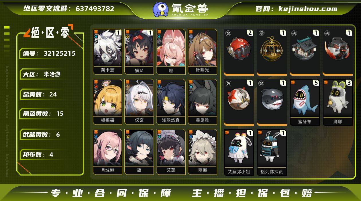 冒险等级:55 总黄数:24 五星角色数:15 菲林底片数量:0 菲林数量:0 加密母带数量:0 1命莱卡恩,1命猫又,0命叶瞬光,0命照,0命橘福福,0命仪玄,0命浅羽悠真,0命星见雅,0命月城柳,0命简,0命艾莲,0命丽娜,0命「11号」,0命格莉丝 6命苍角,6命派派,6命安比,6命安东,6命可琳,5命潘引壶,5命比利,4命露西,4命本,4命妮可,1命波可娜,1命赛斯,0命真斗 2精钢铁肉垫,1精青溟笼舍,1精霰落星殿,1精嵌合编译器,1精燃狱齿轮,1精深海访客 5精鲨牙布,3精狮耶,1精艾丝弥小姐,1精格列佛探员 墨形影踪,晴澜双迹套装,漪光夜曲