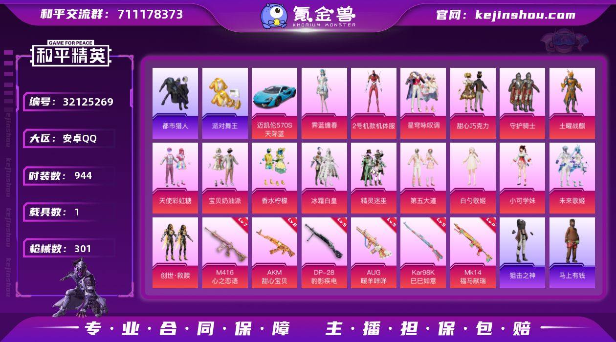 【主播推荐】实名: 不可修改 时装数: 944 载具数: 1 枪械数: 301 战备数: 214 热门装扮: 甜心巧克力,守护骑士,宝贝奶油派,天使彩虹糖,暗夜武装,土曜战麒,迅捷狂鲨,鹰眼刺客,都市猎人,恒星战甲,香水柠檬,冰霜白皇,精灵迷巫,2号机款机体服,仓鼠灰灰,奇迹天团,蔷薇魔法师,派对舞王,第五大道,小可学妹,白勺歌姬,未来歌姬,创世·救赎,星穹咏叹调,霁蓝缠春 载具: 迈凯伦570S(天际蓝) 稀有枪皮: AKM甜心宝贝,M416心之恋语,Kar98K-巳巳如意,AUG-暖羊咩咩,DP-28-豹影疾电