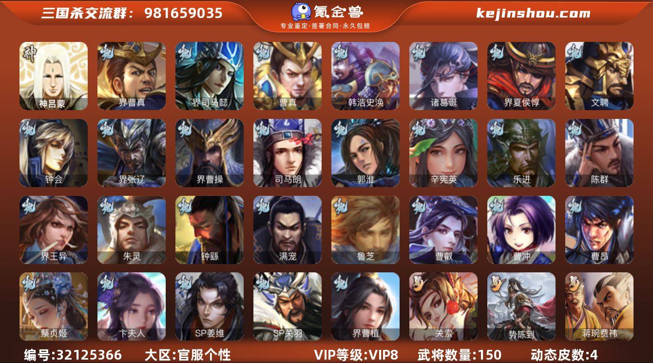 【4194】官阶:先锋将军;VIP等级:VIP8;史诗武将数量:2;动态皮肤数量:4;武将总数:150;史诗宝珠数量:48;将魂数量:4347;神将:0;魏国史诗武将:0;蜀国史诗武将:1;吴国史诗武将:0;群史诗武将:0 界曹真,关索,神吕蒙,SP关羽,乐进,曹昂,诸葛诞,朱灵,文聘,SP姜维,钟会,曹冲,郭淮,满宠,界王异,界曹操,界司马懿,界夏侯惇,界张辽,曹真,韩浩史涣,陈群,曹叡,钟繇,司马朗,辛宪英,鲁芝,界曹植,卞夫人,蔡贞姬,势陈到,SP孙尚香,夏侯霸,关兴张苞,廖化,界马岱,关平,刘封,界关兴张苞,界刘备,界赵云,界马超,SP徐庶,吴懿,周仓,张松,界简雍,彭羕,谋庞统,蒋琬费祎,甘夫人,凌操,诸葛瑾,孙鲁育,程普,韩当,潘璋马忠,虞翻,朱然,界黄盖,界周瑜,界大乔,界陆逊,孙鲁班,朱桓,界孙尚香,吕岱,界韩当,孙翊,谋周瑜,伏完,界袁术,张宝,伏皇后,李儒,界于吉,华雄,袁术,公孙渊,蹋顿,樊稠,界公孙瓒,丁原,皇甫嵩-奋钺振旅(动态)