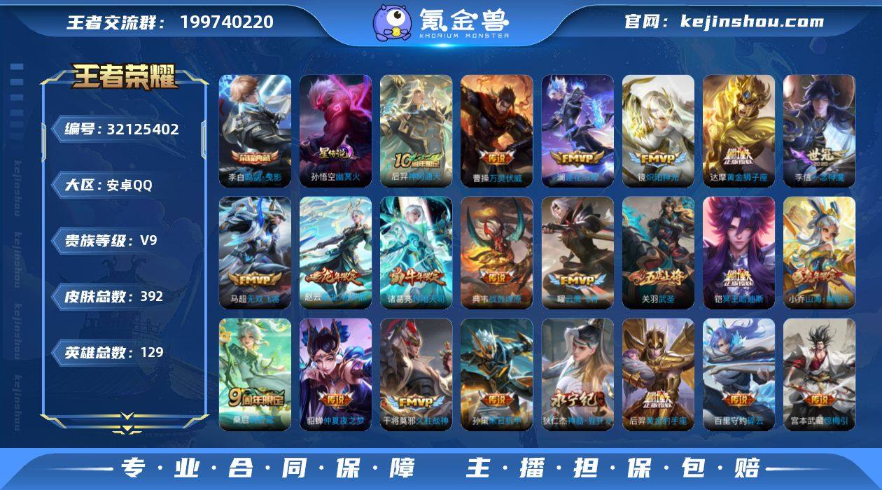贵族等级:V9 典藏皮肤数:1 珍品无双皮肤数:0 无双皮肤数:0 珍品传说皮肤数:0 传说皮肤数:27 史诗皮肤数:109 皮肤数:392 英雄数:129 段位:星耀