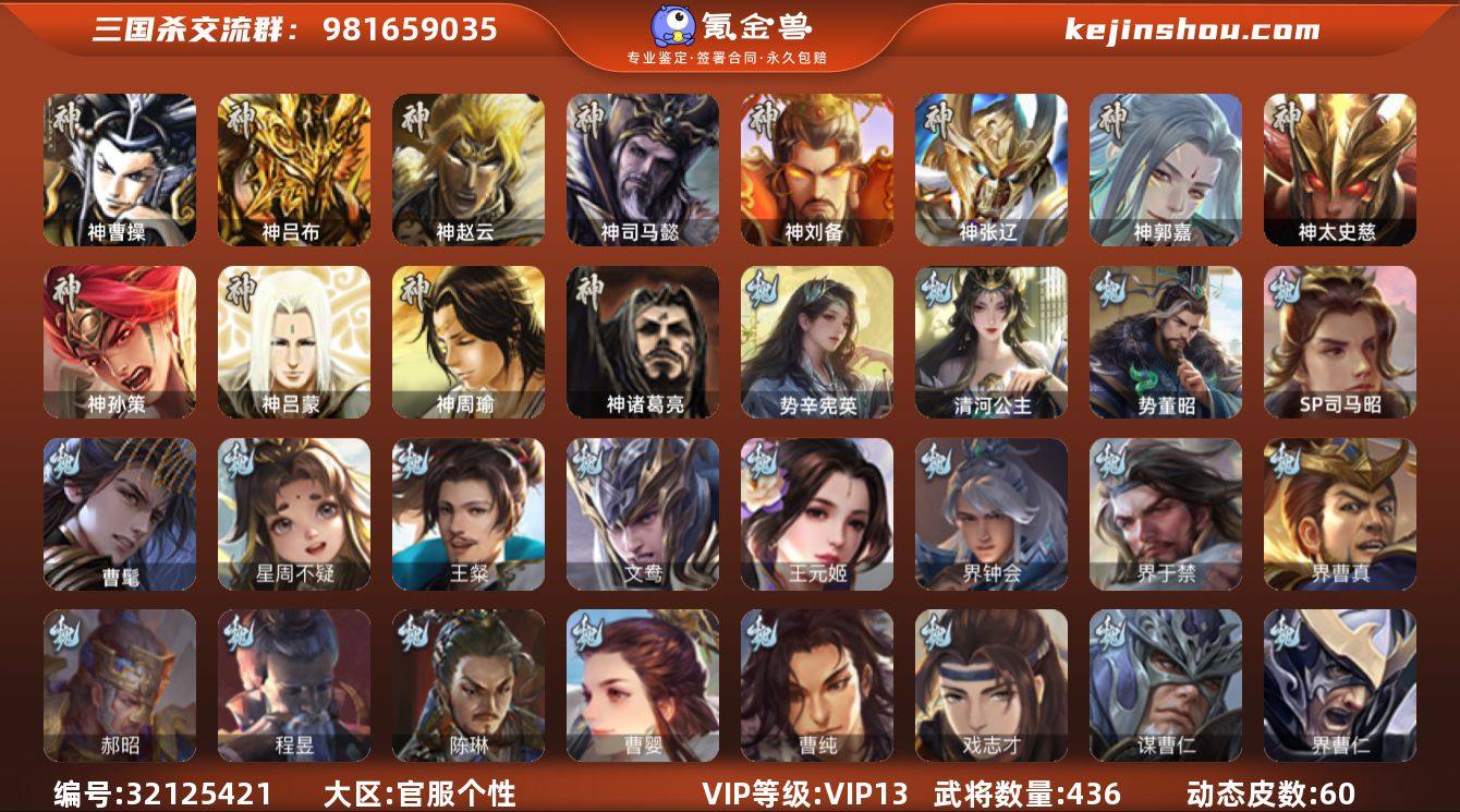 【3182】官阶:大将军;VIP等级:VIP13;史诗武将数量:75;动态皮肤数量:60;武将总数:436;史诗宝珠数量:94;将魂数量:11543;神将:10;魏国史诗武将:32;蜀国史诗武将:15;吴国史诗武将:12;群史诗武将:23 神曹操,神吕布,神赵云,神司马懿,神刘备,神张辽,神郭嘉,神太史慈,神孙策,神诸葛亮,SP司马昭,曹髦,星周不疑,谋曹仁,王粲,王元姬,界钟会,界于禁,界曹真,郝昭,陈琳,曹婴,曹纯,戏志才,势董昭,清河公主,势辛宪英,程昱,关索,马云騄,谋黄忠,谋赵云,谋马超,诸葛瞻,赵襄,张星彩,王平,沙摩柯,谯周,界黄忠,花鬘,董允,谋关羽,谋陆逊,吴景,孙皓,孙寒华,骆统,界朱然,界徐盛,贺齐,势陆郁生,势太史慈,文鸯,谋貂蝉,左慈,张让,张琪瑛,星黄忠,星甘宁,王允,陶谦,司马徽,麹义,南华老仙,刘焉,沮授,界左慈,界李儒,公孙康,杜预,卑弥呼,许攸,星董卓,兀突骨,司马昭,神吕蒙,神周瑜,SP关羽,SP曹仁,SP蔡文姬,乐进,曹昂,诸葛诞,朱灵,文聘,SP姜维,张春华,钟会,曹冲,郭淮,满宠,界王异,界曹操,界司马懿,界夏侯惇,界张辽,界许褚,界郭嘉,李典,曹真,韩浩史涣,陈群,曹叡,曹休,钟繇,司马朗,王基,李通,郭皇后,孙资刘放,辛宪英,界甄姬,吕虔,鲁芝,蒯越蒯良,界荀彧,界徐晃,杜畿,界曹丕,毌丘俭,界邓艾,张恭,界曹植,界曹彰,界满宠,界郭淮,卞夫人,华歆,蔡贞姬,袁涣,崔琰,毛玠,谋徐晃,谋于禁,牵招,胡班,司马孚,谋张辽,牛金,界夏侯渊,界曹仁,臧霸,唐咨,董昭,SP孙尚香,关银屏,夏侯霸,马良,关兴张苞,廖化,界马岱,关平,简雍,刘封,界法正,界关兴张苞,界刘备,界关羽,界张飞,界赵云,界马超,SP徐庶,吴懿,周仓,张松,刘谌,夏侯氏,糜竺,马忠,孙乾,李严,黄皓,界黄月英,界诸葛亮,赵统赵广,严颜,界伊籍,界庞统,界孟获,界祝融,陈到,界姜维,界刘禅,吕凯,张翼,杨仪,邓芝,傅肜,界简雍,陈震,费祎,糜夫人,王甫赵累,界周仓,宗预,刘巴,界吴懿,彭羕,谋庞统,谋黄月英,界张嶷,谋张飞,吴...