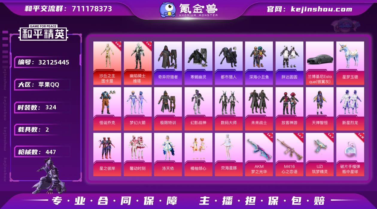 苹果 【极品神装号 幽焰骑士-维塔(一级)/沙丘之主-图卡盟(五级)/怪诞乔克/梦幻火箭/寒蝎幽灵/浪漫天命/都市猎人/深海小丑鱼/奇异狩猎者/暗影哥特/红熊茄茄/放客神游/洛天依/AKM-梦之光华(七级)/M416-心之恋语(七级)/兰博基尼Estoque(银翼灰)】手Q-无敌战神框-2神装-15粉装-21特效枪-2载具-10粉色飞行器-157545热力值-26王牌印记-324套装-447枪皮 【红色神装等级】:幽焰骑士-维塔(一级),沙丘之主-图卡盟(五级) 【红色角色神装】:幽焰骑士-维塔,沙丘之主-图卡盟 【热门品类】:粉装-怪诞乔克,粉装-梦幻火箭,套装-寒蝎幽灵,套装-浪漫天命,套装-都市猎人,套装-深海小丑鱼,套装-奇异狩猎者,套装-胖达圆圆,套装-金羽特工,套装-忍者信条,套装-暗夜之虎,套装-龟仙人,套装-潮萌小黄鸭,套装-暗影哥特,套装-浪漫波比,熔岩游骑兵连帽夹克,套装-红熊茄茄 【粉色套装】:粉装-极限特训,粉装-幻影战神,粉装-数码大师,粉装-未来战士,粉装-怪诞乔克,粉装-梦幻火箭,粉装-放客神游,粉装-天禅智恒,粉装-新星烈龙,粉装-星之彼岸,粉装-馨动时刻,角色-洛天依,粉装-橘柚倾心,角色-荧海星豚 【粉色枪皮等级】:AKM-梦之光华(七级),AKM-幽焰骑士(三级),M416-心之恋语(七级),GROZA-镜光银凌(五级),AUG-星梦奇缘(三级),AUG-许七安(四级),M762-青锋波束(五级),蜜獾-荧海星豚(四级),UZI-筑梦精灵(七级),Vector-环太平洋(四级),AKS-74U-森灵之息(四级),P90-沙丘之主(三级),Kar98K-巳巳如意(五级),M24-镜域双华(三级),Mk14-福马献瑞(五级),AMR-智耀战神(五级),DP-28-豹影疾电(五级),MG3-洛神天依(一级),燃烧瓶-薄荷可可(五级),破片手榴弹-瓶中星球(六级) 【粉色载具】:兰博基尼Estoque(银翼灰),星梦玉骢 【粉色枪皮】:AKM-梦之光华,AKM-幽焰骑士,M416-心之恋语,GROZA-镜光银凌,AUG...