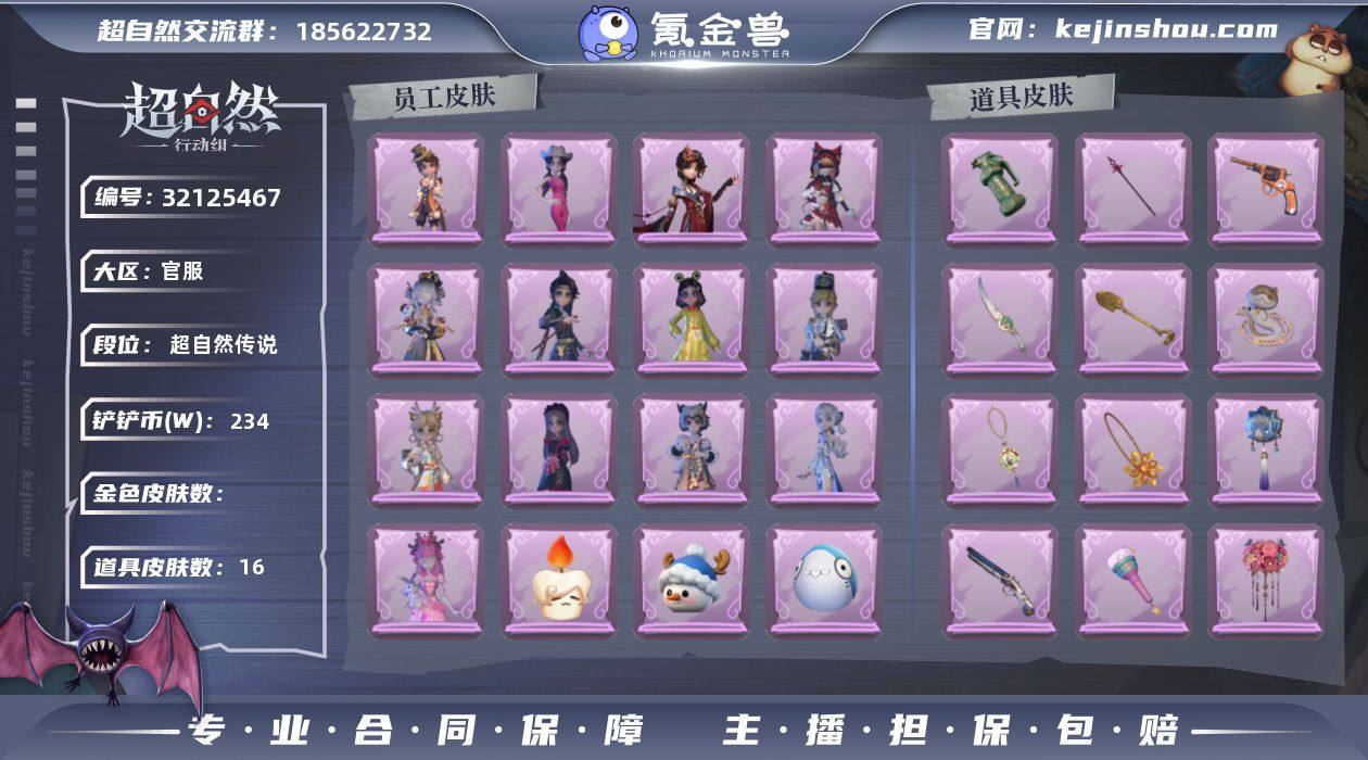 紫皮13;道具皮16;皮肤:阿念-灵昭鹿鸣,爱丽丝-耀眼的你,莉莉-莓果陷阱,逍遥-绣春逍影,小黄-霓裳踏雪,薇薇安-仙锋小姐,巫铃儿-素影瑶光,爱丽丝-丝缕哀歌,阿念-王子与骑士,莉莉-除妖小师妹,莉莉-情公主,小黄-呱呱雨衣,阿念-庆宴绮愿;道具:摸金符-花落精绝,专业手电-云端梦想计划,长枪-罪棘,摸金符-紫霄,闪光弹-金戈玄铜,刺刀-碧络琅环,长鞭-小狗蛇点点鞭,音响-鸣沙鼓,夜视仪-金丝眼镜,铲子-龙鳞,短管猎枪-星光的裁决,腰包-红运福虎,急救包-蔷薇物语,额外的背包-飞花令,腰包-月下莲台,转轮手枪-新星时代;美妆:美妆-暗夜小恶魔;饰品:头饰-烛光纪念,头饰-太空鲨头套,头饰-滑稽头套,头饰-呆滞头套,头饰-小狗蛇点点头套,头饰-马上有钱,头饰-炙热烧烤,头饰-大葱明头套,头饰-面具马头套,头饰-火爆了头套,头饰-芝麻糊汤圆,头饰-鱼头怪头套,头饰-雪墩墩头套,头饰-萨卡班甲鱼头套,头饰-蒜了八,头饰-惊魂南瓜头套,头饰-烈焰红唇头套,头饰-哈士奇头套,头饰-樱桃奶油布丁,头饰-卑微头套,头饰-鳄霸天头套,头饰-驼半仙头套,头饰-嘻嘻头套,头饰-像素朋克墨镜,头饰-后室幸存者头套,挂饰-天使消失的年代,挂饰-钗头凤,挂饰-未竟乐园,挂饰-孤独对望,挂饰-九色祥鹿,挂饰-糖果守卫,挂饰-小鲨包包,背饰-天使的呼唤,背饰-云梦之星,背饰-牛啤背包,背饰-蝶恋花,背饰-小小罗丽,背饰-毛球夹子;动作:动作-新年摇,动作-敲门舞,动作-舞台中心,动作-鹏友摇,动作-luvaboy,动作-DL摇,动作-拜年,动作-抬手,动作-要糖,动作-带你逃跑吧,动作-KT猫摇,动作-律动迪斯科,动作-举牌;工牌背景:工牌背景-卷珠帘,工牌背景-童话扉页,工牌背景-情语塔,工牌背景-佛系小豚,工牌背景-粉嫩小海狸,工牌背景-永夜巡礼,工牌背景-点点萌伴,工牌背景-蓝海奇遇,工牌背景-复活的肖像,工牌背景-圣光之誓;工牌动作:工牌动作-虔诚之姿,工牌动作-净禅;员工:爱德华,...