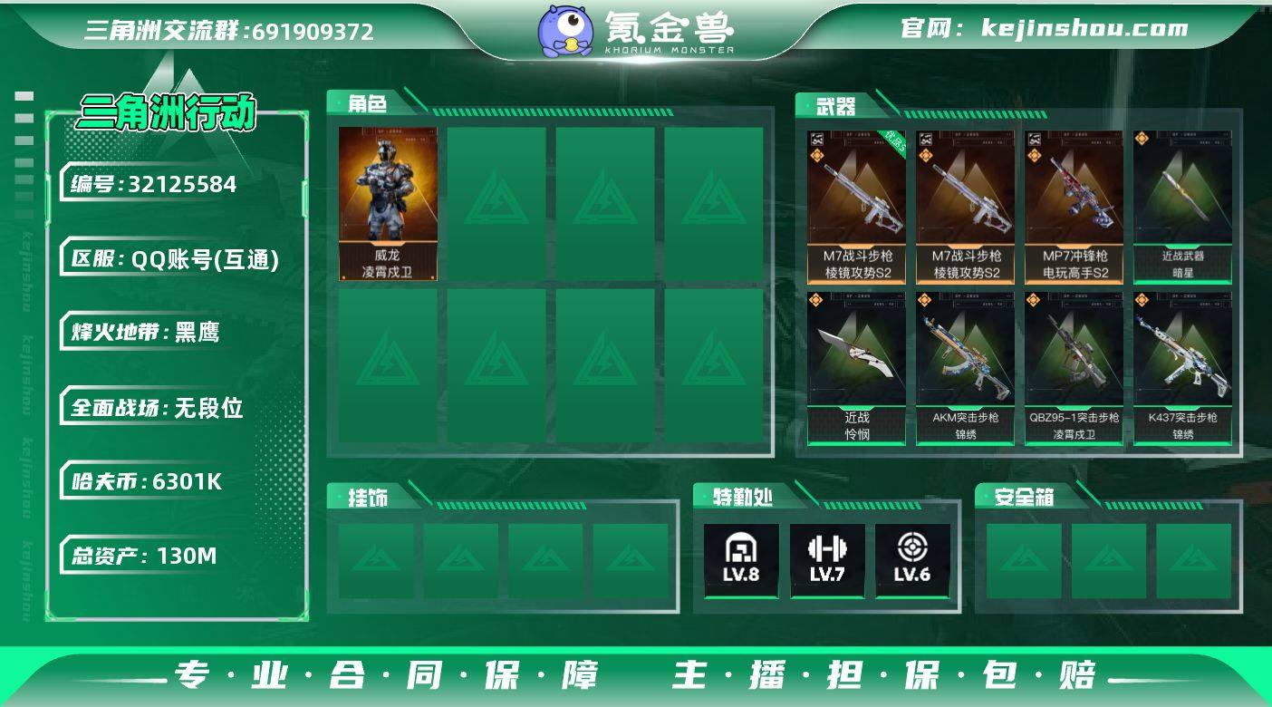 A11699/可二次/QQ区【总资产:130.4M+80发aw+M7棱镜攻势优品S+MP7电玩高手S2极品C+近战暗星+近战怜悯+威龙凌霄戍卫+仓库8+满体+负重6】/烽火等级:60级/全面战场:1级/纯币:6301K/三角券加币:326(三角币326+三角券0)【优品C-M7战斗步枪-棱镜攻势S2】【极品C-MP7冲锋枪-电玩高手S2】【近战-怜悯/近战-暗星】【威龙-凌霄戍卫】/部门:33333/特勤等级(技术中心3级/工作台3级/制药台3级/防具台3级/仓库8级/指挥中心6级/训练中心7级/靶场6级/潜水中心1级/收藏室1级)AKM突击步枪-锦绣/QBZ95-1突击步枪-凌霄戍卫/K437突击步枪-锦绣/MK47突击步枪-暗星/AWM狙击步枪-万金泪冠/橙色挂饰x2/段位:黑鹰(流动资产:94.9M)/详细看图