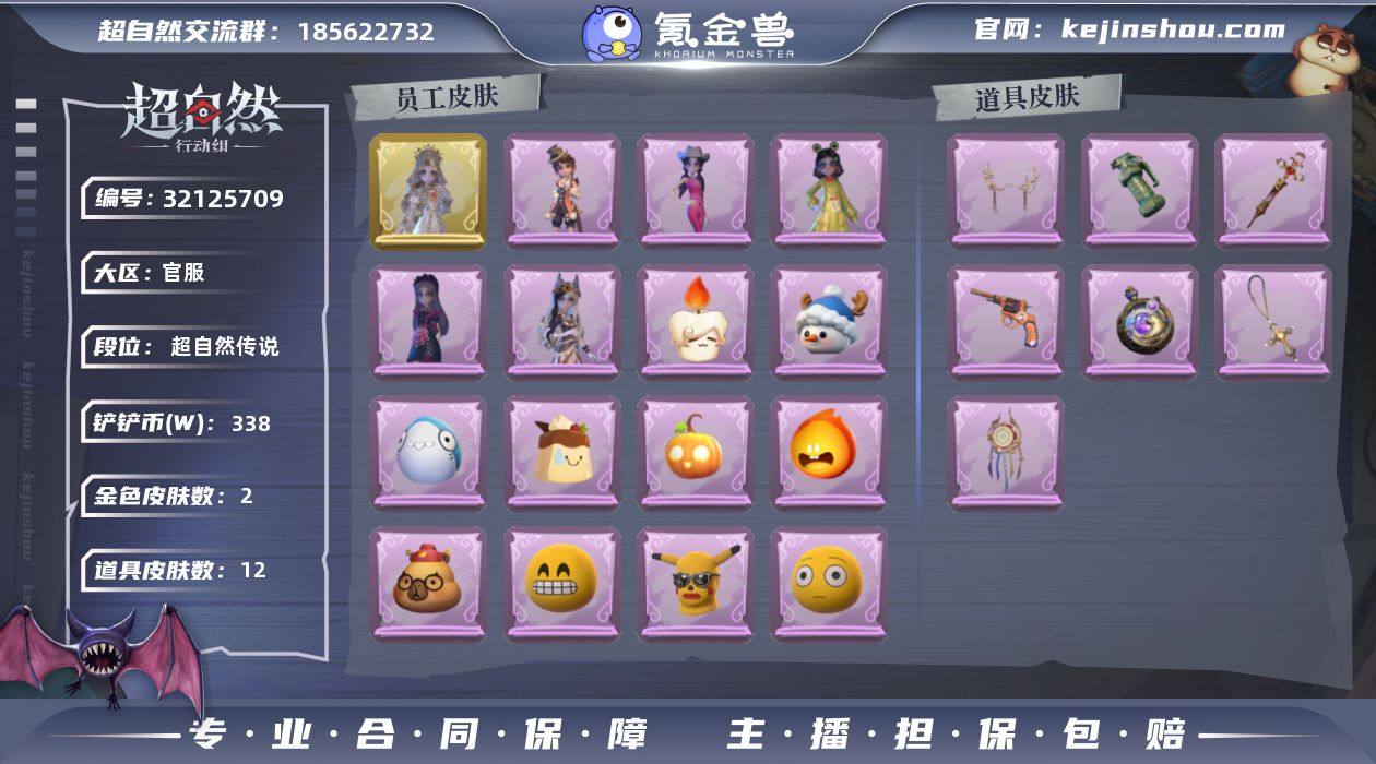 金皮2;紫皮5;道具皮12;皮肤:薇薇安-海月息潮,薇薇安-圣光之谕,爱丽丝-耀眼的你,爱丽丝-丝缕哀歌,阿念-庆宴绮愿,小黄-呱呱雨衣,薇薇安-白光莹;道具:传送按钮-逆时审判,急救包-末章心跳,腰包-红运福虎,摸金符-海洋之心,喷气背包-乘风溯雪,急救包-蔷薇物语,夜视仪-敛花容,音响-月光奏鸣曲,音响-鸣沙鼓,摸金符-祝祷词,闪光弹-金戈玄铜,转轮手枪-新星时代;美妆:美妆-萌兔气泡;饰品:头饰-鱼头怪头套,头饰-萨卡班甲鱼头套,头饰-呆滞头套,头饰-大葱明头套,头饰-太空鲨头套,头饰-炙热烧烤,头饰-雪墩墩头套,头饰-饺饺者头套,头饰-面具马头套,头饰-火爆了头套,头饰-滑稽头套,头饰-小狗蛇点点头套,头饰-卑微头套,头饰-嘻嘻头套,头饰-樱桃奶油布丁,头饰-小财神豚豚头套,头饰-烈焰红唇头套,头饰-哈士奇头套,头饰-蒜了八,头饰-马上有钱,头饰-烛光纪念,头饰-惊魂南瓜头套,头饰-像素朋克墨镜,头饰-后室幸存者头套,挂饰-桂冠聆诗,挂饰-拂云仙,挂饰-晚安小熊,挂饰-小鲨包包,挂饰-糖果守卫,挂饰-孤独对望,挂饰-钗头凤,挂饰-未竟乐园,挂饰-天使消失的年代,背饰-炽天使的余烬,背饰-侧耳倾听,背饰-牛啤背包;动作:动作-来财舞,动作-知世摇,动作-打车摇,动作-新年摇,动作-鹏友摇,动作-luvaboy,动作-DL摇,动作-舞台中心,动作-拜年,动作-要糖,动作-抬手,动作-举牌;工牌背景:工牌背景-珊瑚海,工牌背景-鸢尾花,工牌背景-永夜巡礼,工牌背景-心同野鹤,工牌背景-甜酷指令,工牌背景-雷霆轩,工牌背景-点点萌伴,工牌背景-粉嫩小海狸,工牌背景-童话扉页;工牌动作:工牌动作-净禅,工牌动作-蜕变,工牌动作-春色盈怀;员工:小满,员工-兰,员工-巫铃儿,员工-爱德华,员工-临云,员工-爱丽丝,员工-阿念,员工-莉莉,员工-逍遥,员工-零,员工-小黄,员工-薇薇安,员工-艾伦;累充662元;铲铲币33.8万;金砖14;段位:超自然传说27;魔盒等级:11