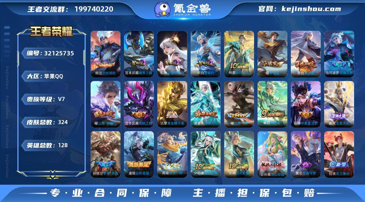 【aswz1634】苹果Q-V7-至尊星耀V段位-128英雄-324皮肤-1典藏皮肤-14传说-109史诗 【英雄全皮】:嬴政全皮,孙权全皮,鬼谷子全皮,狂铁全皮,敖隐全皮,空空儿全皮,影全皮 【荣耀典藏】:韩信弑枪猎影 【传说皮肤】:杨戬纵目迁山,嬴政玄雷天君,桑启鸣野蒿,曜山海苍雷引,马可波罗深海之息,曜李逍遥 ,诸葛亮时雨天司,虞姬启明星使,孙悟空零号赤焰,曜云鹰飞将,达摩黄金狮子座,貂蝉仲夏夜之梦,李白凤求凰,宫本武藏地狱之眼 【限定皮肤】:蔡文姬夏日便利店,大乔绒语心约,虞姬夏日便利店,姜子牙天穹之誓,狄仁杰阴阳师,赵云皇家上将,赵云引擎之心,赵云百木心枪,墨子神迹守卫,嬴政优雅恋人,嬴政白昼王子,孙尚香蔷薇恋人,鲁班七号狮舞东方,阿轲迷踪丽影,钟无艳超时空战士,扁鹊奇幻香踪,吕布猎兽之王,周瑜赤莲之焰,元歌云间偶戏,夏侯惇朔风刀,甄姬游园惊梦,甄姬落雪兰心,典韦蓝屏警告,马可波罗逐梦之星,马可波罗暗影游猎,马可波罗深海之息,马可波罗山海玄木吟,狄仁杰魔术师,狄仁杰万华元夜,达摩星际陆战队,达摩沙漠行僧,项羽海滩派对,老夫子醍醐杖,老夫子航海奇遇记,程咬金演武夺筹,刘邦夺宝奇兵,韩信飞衡,韩信傲雪梅枪,王昭君午后时光,兰陵王驯魔猎人,兰陵王金庭之子,花木兰青春决赛季,亚瑟潮玩骑士王,孙悟空至尊宝,孙悟空大圣娶亲,孙悟空零号赤焰,牛魔御旌,李元芳云中旅人,虞姬霸王别姬,虞姬启明星使,钟馗神迹守卫,钟馗驱傩正仪,杨戬潮玩骑兵,女娲朔望之晖,哪吒逐梦之翼,雅典娜单词大作战,雅典娜黎明之约,蔡文姬繁星吟游,鬼谷子原初探秘者,鬼谷子五谷丰年,诸葛亮时雨天司,苏烈千军破阵,百里玄策原初追逐者,弈星混沌棋,梦奇顽趣,公孙离蜜橘之夏,沈梦溪大漠名商,沈梦溪匿光破解者,明世隐疑决卦,裴擒虎天狼狩猎者,裴擒虎李小龙,裴擒...