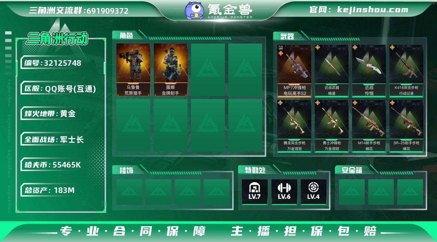 【热门多刀号-暗星+怜悯+单典藏】【无二次】YXz9024-特勤处:仓库7级/靶场4级/训练中心6级183m总资产-5546w哈伏币-60烽火等级-黄金-27战场等级-军士长 【干员外观】:露娜-金牌射手,乌鲁鲁-荒原猎手 【近战皮肤】:近战-暗星,近战-怜悯,近战-处刑者4级,近战-黑鹰 【典藏外观】:MP7冲锋枪-电玩高手S2 【典藏外观成色】:MP7冲锋枪-电玩高手S2(优品B) 【传说外观】:K416突击步枪-行动记录,AUG突击步枪-悠然茶歇,SG552突击步枪-运动员,SCAR-H战斗步枪-荼蘼,腾龙突击步枪-万金泪冠,MK47突击步枪-悠然茶歇,MK47突击步枪-暗星,UZI冲锋枪-悠然茶歇,SR-3M紧凑突击步枪-暗星,SR-3M紧凑突击步枪-荼蘼,勇士冲锋枪-万金泪冠,PKM通用机枪-荼蘼,M14射手步枪-蛮荒,M14射手步枪-缄花,SR-25射手步枪-缄花,AWM狙击步枪-万金泪冠,.357左轮-缄花 【史诗外观】:AK-12突击步枪-原型机,K416突击步枪-腊梅,M7战斗步枪-百步穿杨,SG552突击步枪-哈夫克警备,G3战斗步枪-流沙送葬,G3战斗步枪-哈夫克警备,AS Val突击步枪-百步穿杨,K437突击步枪-丛影谍踪,MP5冲锋枪-深海恐惧,Vector冲锋枪-百步穿杨,SR-3M紧凑突击步枪-开工大吉,勇士冲锋枪-丛影谍踪,MP7冲锋枪-六套之力,PKM通用机枪-阿萨拉特攻,M249轻机枪-丛影谍踪,VSS射手步枪-丛影谍踪,M14射手步枪-工业狂潮, M14射手步枪-航天庆典,M700狙击步枪-竞技风,M700狙击步枪-百步穿杨,M700狙击步枪-哈夫克警备,AWM狙击步枪-流沙送葬 【稀有外观】:K437突击步枪-巨兽,AKS-74U突击步枪-休闲时光,M4A1突击步枪-繁盛,ASh-12战斗步枪-繁盛,K416突击步枪-一帆风顺,M7战斗步枪-前沿科技,SG552突击步枪-2026,SG552突击步枪-马年新春,SG552突击步枪-贴花艺术, AK-12突击步枪-马年新春,G3战斗步枪-主宰,G3战斗步枪-猛禽,CAR-15突击步枪-来财,KC17突...