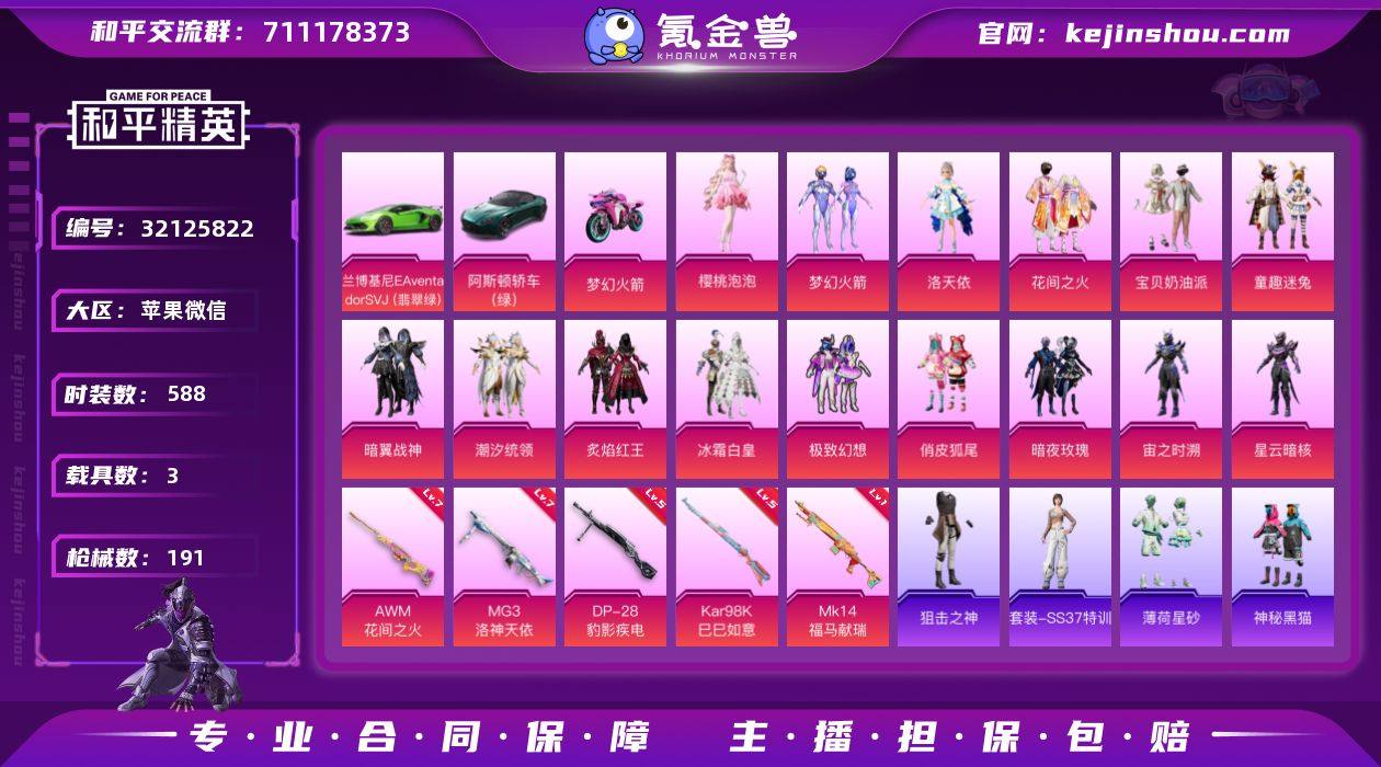 【15粉5枪3车 暗夜魅影 都市丽猫 雪山精英 洛天依 兰博基尼 樱桃泡泡 可二次秒改】 实名: 可修改 时装数: 588 载具数: 3 枪械数: 191 战备数: 152 热门装扮: 梦幻火箭(新101),宝贝奶油派,浪漫波比,暗翼战神,极致幻想,炙焰红王,花间之火,冰霜白皇,潮汐统领,童趣迷兔,俏皮狐尾,暗夜玫瑰,洛天依,仓鼠灰灰,激萌罗小黑,神秘黑猫,暗夜魅影,宙之时溯,星云暗核,樱桃泡泡 载具: 双人摩托-梦幻火箭,阿斯顿·马丁DBS(绿),兰博基尼Aventador SVJ(翡翠绿) 稀有枪皮: MG3洛神天依,AWM花间之火,Kar98K-巳巳如意,DP-28-豹影疾电