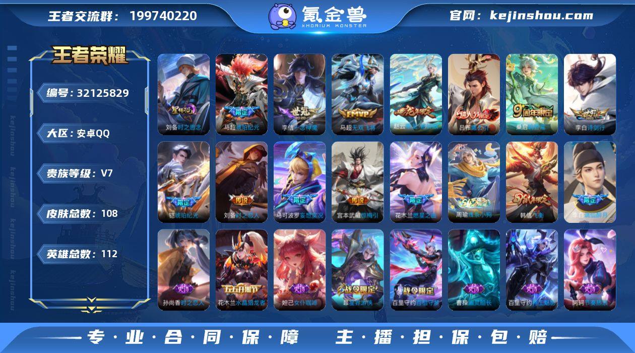 贵族等级:V7 典藏皮肤数:0 珍品无双皮肤数:0 无双皮肤数:0 珍品传说皮肤数:0 传说皮肤数:12 史诗皮肤数:23 皮肤数:108 英雄数:112 段位:非凡王者 卖家说:传说皮肤12个