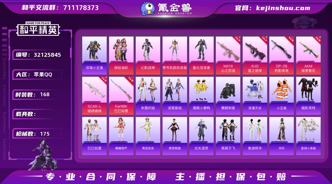 【特价出售/店主推荐】 苹果 手Q-4粉装-8特效枪-0载具-1粉色飞行器-57122热力值-6王牌印记-168套装-175枪皮 【热门品类】:粉装-缤纷油彩,套装-浪漫天命,套装-深海小丑鱼,套装-小丑鱼,套装-潮萌小黄鸭,套装-暗影哥特 【粉色套装】:粉装-幻影战神,粉装-缤纷油彩,角色-零号机款机体服,角色-复仇流浪者 【粉色枪皮等级】:AKM-绿萝繁花(五级),SCAR-L-锦绣绵绵(五级),M416-心之恋语(七级),AUG-星之彼岸(七级),UMP45-萌骑冒险(二级),Kar98K-巳巳如意(五级),Mk14-福马献瑞(二级),DP-28-豹影疾电(五级) 【粉色枪皮】:AKM-绿萝繁花,SCAR-L-锦绣绵绵,M416-心之恋语,AUG-星之彼岸,UMP45-萌骑冒险,Kar98K-巳巳如意,Mk14-福马献瑞,DP-28-豹影疾电 【粉色飞行器】:时空协奏飞行器 【粉色降落伞】:垂柳戏鸭降落伞,炫光之旅降落伞,莲影清波降落伞,幻彩电音降落伞,绯穹魔姬降落伞 【稀有套装】:套装-巳巳如意,套装-马上来财,套装-糖糖葫芦,套装-青团波波,角色-摩登魅猫,角色-光矢逐梦,套装-燕燕于飞,套装-鱼渊荷华,角色-风玲,套装-星渊小夜曲,套装-朱霞炽焰,套装-凌霄紫焰 【稀有枪皮】:AKM-影袭,AKM-灼热熔岩,AKM-破晓战魂,AKM-萌趣颜团子,AKM-龙的传人,M16A4-幻世战舞者,SCAR-L-炫彩节奏,SCAR-L-玉兔迎春,SCAR-L-甜蜜誓约,M416-夜灯,M416-糯团青竹,M416-红色方程式,M416-蓝色火焰,GROZA-彩虹符号,GROZA-影袭,GROZA-田园牧歌,AUG-青春冒险家,QBZ-彩虹符号,QBZ-飞驰魅影,M762-天降萌叽,M762-牛气冲天,Mk47-妙红点点,Mk47-青春冒险家,G36C-不夜海上花,AC-VAL-天降萌叽,AC-VAL-快闪甜心,蜜獾-娇憨猪猪,ARX-凌霄紫焰,UZI-众神之王,UZI-啾咪啾咪,UZI-娇憨猪猪,UZI-影袭,UZI-炫彩节奏,UZI-月影灵韵,UMP45-蓝色火焰,Vector-PEL轰鸣竞梦者,Vector-彩虹符...