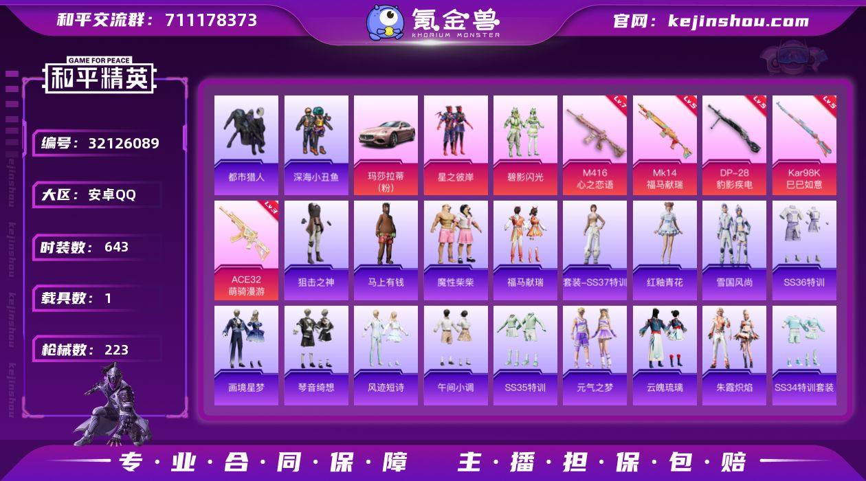 实名:可二次实名 是否支持人脸包赔:支持 粉装数量:2 特效枪数量:5 载具数:1 时装数:643 枪械数:223 都市猎人,深海小丑鱼 碧影闪光,星之彼岸 七级M416-心之恋语,五级MK14-福马献瑞,五级DP-28-豹影疾电,五级Kar98K-巳巳如意,三级ACE32-萌骑漫游 玛莎拉蒂Ghibli(粉) 狙击之神,马上有钱,魔性柴柴,福马献瑞,红釉青花,SS37特训,雨过天青,雪国风尚,画境星梦,琴音绮想,SS36特训,风迹短诗,SS35特训,午间小调,元气之梦,云魄琉璃,凌霄紫焰,SS34特训套装,朱霞炽焰,冰川特警,冰冻风暴,缤纷果语,暴风机械师,滨海厨神,白糯汤圆,白色伏地魔,白熊同盟,白月香洋装,长空猛禽,潮流炫酷,大橘大利,都市丽猫,都市猎人,都市魅力,都市漫游者,电音精灵,飞驰魅影,绯格组合,风华少年志,粉红小猪,福星高照,格斗先锋,龟仙人,光之冒险,鹤鸣,虎虎生威吉莉,湖蓝色名流,黑色伏地魔,黄色伏地魔,黄色名流,海上生明月,黄色运动,红色运动,幻世战舞者,幻影武者,极地朋克,军刀雅典娜,酒红色名流,橘黑制服,娇憨猪猪,竞技达人朋克,竞技名士,吉莉礼服,极速红龙,极速竞梦,街头潮人,街头风暴,军械专家,金羽特工,蓝冰羽,蓝彩潮人,蓝调潮人,龙的传人,灵公主,龙魂突击队,猎鹰,镭射皇者,蓝色运动,恋语绒绒,冷焰舞者,猛禽,萌黄之夏,魅力单车,麻辣教官,萌趣咩咩,萌趣颜团子,梦魇先生,弄潮海豚,逆风勇士,霓虹极客,霓虹街区,牛气冲天,牛气满满,破蛋小黄鸡,破晓战魂,轻风白浪,绮丽涂鸦,青年教官,俏皮奶喵,青涩时光,青玉碎影,云朵鹅,瑞龙福将,人气偶像,热血青春,深海小丑鱼,闪金天王,时空追击者,深蓝色名流,SS10特训,SS11特训,SS12特训,SS13特训,SS14特训,SS15特训,SS16特训,SS17特训,SS18特训,SS19特训,SS20特训,SS21特训,SS22特训,SS23特训,SS24特训,SS25特训,SS27特训,SS28特训,SS29特训,SS30特训套装,SS31特训套装,SS32特训套装,SS33特训套装,SS9特训,巳巳如意,探宝勇士,特训学院,团圆交子,田园牧歌,特种颜团子,特战装甲,完美偶像,迅捷狂鲨,炫蓝之夏,雪绒豹,夏日音浪,星途旅人,绚紫流光,银白舞王,原初圣火,异彩先驱,耀粉歌者,音速流光,玉兔迎春,鱼渊荷华,耀眼新星,燕燕于飞,异域银装,战地督导,智慧隐士,朱雀圣者,紫幽梦,灼焰舞者 天之羽翼飞行器,炫彩糖果降落伞,暗星紫秘降落伞,彩虹甜喵降落伞,春暖花开降落伞,风花雪月降落伞,鬼刀降落伞,海渊国主降落伞,冷魅冰骑降落伞 卖家说:身法极品号 已开通手册可抽取小金鞋 地铁差不多满天赋。研究所已修好