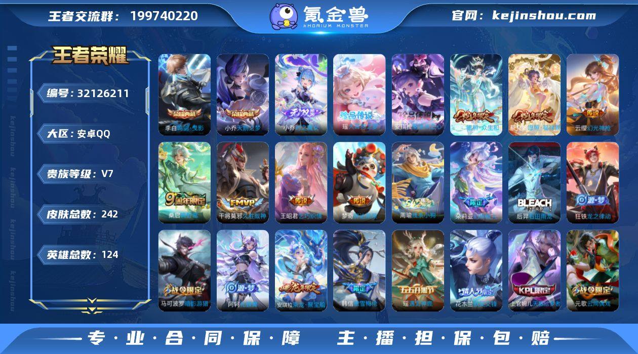 贵族等级:V7 典藏皮肤数:2 珍品无双皮肤数:0 无双皮肤数:1 珍品传说皮肤数:2 传说皮肤数:7 史诗皮肤数:75 皮肤数:242 英雄数:124 段位:钻石 卖家说:精品女大一手号 皮肤自己看