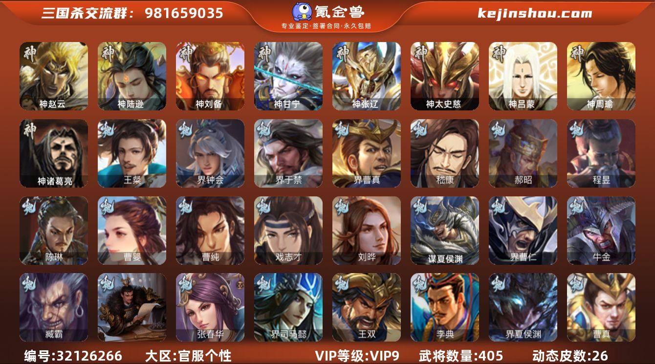 【3263】官阶:大将军;VIP等级:VIP9;史诗武将数量:50;动态皮肤数量:26;武将总数:405;史诗宝珠数量:47;将魂数量:6856;神将:7;魏国史诗武将:8;蜀国史诗武将:12;吴国史诗武将:6;群史诗武将:14 神赵云,神陆逊,神刘备,神甘宁,神张辽,神太史慈,神诸葛亮,王粲,界钟会,界于禁,界曹真,嵇康,郝昭,陈琳,曹婴,曹纯,戏志才,刘晔,程昱,马云騄,谋赵云,谋马超,诸葛瞻,周群,赵襄,张星彩,王平,沙摩柯,谯周,界黄忠,花鬘,骆统,留赞,界朱然,界徐盛,界步练师,贺齐,左慈,张让,星黄忠,陶谦,麹义,祢衡,沮授,界李儒,公孙康,卑弥呼,谋张角,许攸,星董卓,兀突骨,神吕蒙,神周瑜,SP关羽,SP曹仁,SP蔡文姬,乐进,曹昂,诸葛诞,朱灵,文聘,SP姜维,张春华,钟会,曹冲,郭淮,满宠,界王异,界曹操,界司马懿,界夏侯惇,界张辽,界许褚,界郭嘉,李典,曹真,韩浩史涣,陈群,曹叡,曹休,钟繇,司马朗,王基,李通,郭皇后,孙资刘放,辛宪英,界甄姬,吕虔,鲁芝,蒯越蒯良,界典韦,界荀彧,界徐晃,杜畿,界曹丕,毌丘俭,界邓艾,张恭,贾逵,界曹植,界曹彰,界满宠,界郭淮,卞夫人,辛毗,华歆,袁涣,王双,崔琰,毛玠,谋徐晃,谋于禁,牵招,胡班,谋夏侯渊,牛金,界夏侯渊,界曹仁,臧霸,势陈到,SP孙尚香,关银屏,夏侯霸,马良,关兴张苞,廖化,界马岱,关平,简雍,刘封,界法正,界关兴张苞,界刘备,界关羽,界张飞,界赵云,界马超,SP徐庶,吴懿,周仓,张松,刘谌,夏侯氏,糜竺,马忠,孙乾,李严,黄皓,吴苋,秦宓,界黄月英,界诸葛亮,赵统赵广,严颜,界伊籍,界卧龙诸葛,界庞统,界孟获,界祝融,陈到,界姜维,界刘禅,胡金定,吕凯,张翼,杨仪,界廖化,邓芝,傅肜,界简雍,陈震,费祎,糜夫人,王甫赵累,界周仓,向宠,蒋琬,刘巴,界吴懿,界张嶷,谋张飞,霍峻,诸葛果,界魏延,蒋琬费祎,糜芳傅士仁,甘夫人,鲁肃,孙茹,凌操,大乔小乔,诸葛恪,诸葛瑾,孙鲁育,程普,韩当,潘璋马忠,虞翻,朱然,界周泰,界甘宁,界吕蒙,界黄盖,界周瑜,界大乔,...