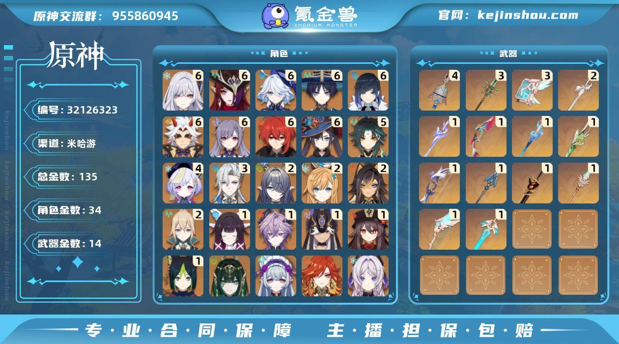 邮箱: 未绑定 总黄数: 135 冒险等级: 60 6命金色角色: 满命迪卢克,满命刻晴,满命莫娜,满命荒泷一斗,满命夜兰,满命流浪者,满命芙宁娜,满命恰斯卡,满命丝柯克 5命金色角色: 五命魈 4命金色角色: 四命七七 3命金色角色: 三命那维莱特 2命金色角色: 二命琴,二命迪希雅,二命爱可菲,二命菈乌玛 1命金色角色: 一命胡桃,一命提纳里,一命赛诺,一命杜林,一命哥伦比娅 0命金色角色: 达达利亚,钟离,甘雨,雷电将军,纳西妲,艾尔海森,艾梅莉埃,基尼奇,希诺宁,玛薇卡,茜特菈莉,梦见月瑞希,奈芙尔 拥有武器: 天空之翼,天空之卷,和璞鸢,风鹰剑,天空之刃,天空之脊,息灾,赤角石溃杵,若水,图莱杜拉的回忆,裁叶萃光,静水流涌之辉,星鹫赤羽,苍耀 4精武器: 图莱杜拉的回忆 3精武器: 天空之卷,和璞鸢 2精武器: 风鹰剑 1精武器: 天空之翼,天空之刃,天空之脊,赤角石溃杵,息灾,若水,裁叶萃光,静水流涌之辉,星鹫赤羽,苍耀 亮点: Y1-YH9130艾尔海森,纳西妲,钟离,雷电将军,甘雨,达达利亚,艾梅莉埃,基尼奇,希诺宁,茜特菈莉,玛薇卡,梦见月瑞希,奈芙尔,赛诺,提纳里,