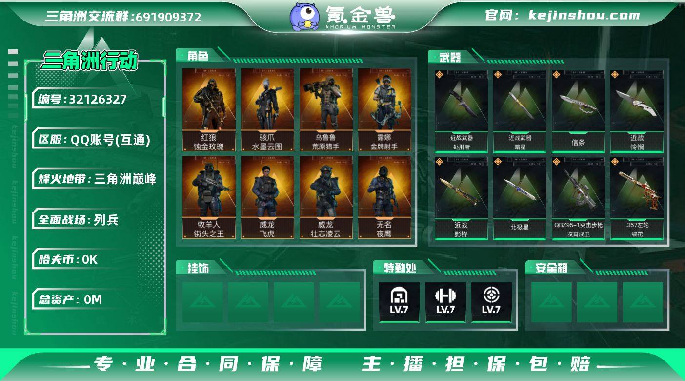实名: 不可修改 烽火地带段位: 三角洲巅峰 全面战场段位: 列兵 总资产: 26 哈夫币: 5 干员外观: 红狼-蚀金玫瑰,牧羊人-街头之王(S2),威龙-壮志凌云(S3),骇爪-水墨云图,无名-夜鹰(S4),威龙-飞虎,蜂医-送葬人·无题密令(S5),露娜-金牌射手(S7),乌鲁鲁-荒原猎手 传说武器皮肤: 近战-怜悯,AS Val突击步枪-动力风潮,SCAR-H战斗步枪-铁艺苍穹,近战-影锋,SR-25射手步枪-水墨云图,SCAR-H战斗步枪-水墨云图,M4A1突击步枪-巳蛇,M7战斗步枪-巳蛇,SMG-45冲锋枪-巳蛇,CAR-15突击步枪-黑鹰坠落,AK-12突击步枪-夜鹰,SMG45冲锋枪-骑士,G18-飞虎,近战-北极星,近战-信条,SR-25射手步枪-信条,SG552突击步枪-运动员,CAR-15突击步枪-白鹰兵势,SMG-45冲锋枪-趣味文化,近战-暗星,近战-处刑者,QBZ95-1突击步枪-凌霄戍卫,.357左轮-缄花,SR-25射手步枪-缄花,M14射手步枪-缄花 亮点: 【优质装备】:近战-怜悯,近战-影锋,近战-北极星