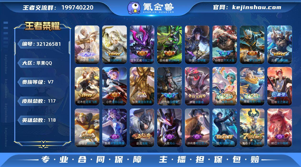 实名: 可修改 性别: 男号 贵族等级: V7 英雄数: 118 皮肤数: 117 无双皮: 无相 传说皮: 冠军飞将,黄金白羊座,炽阳神光,一念神魔,末日机甲-孙尚香,音你心动-小乔,地狱之眼,末日机甲-孙策 限定皮: 龙胆,高山流水,孙行者,五谷丰年,怒海麟威,齐天大圣 亮点: 【优质装备】:冠军飞将,黄金白羊座,炽阳神光,一念神魔,末日机甲-孙尚香(绿蚂蚱),音你心动-小乔,地狱之眼,末日机甲-孙策