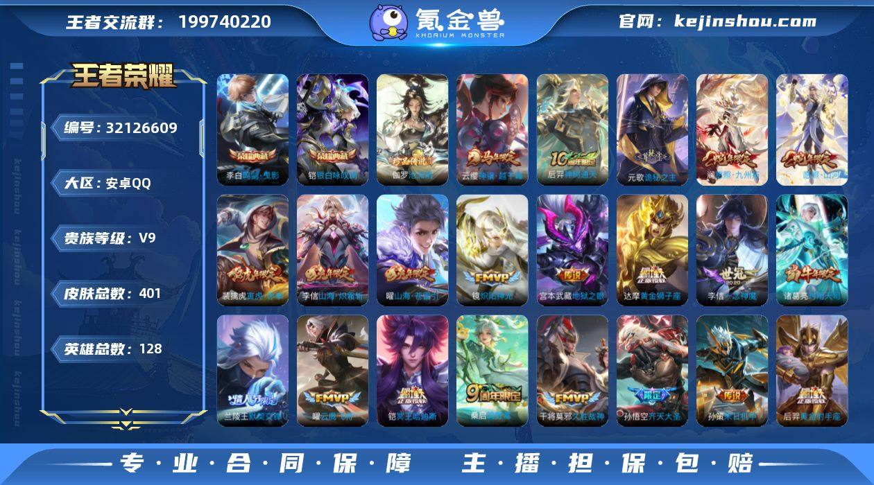 实名: 可修改 贵族等级: V9 英雄数: 128 皮肤数: 401 荣耀水晶: 鸣剑·曳影,银白咏叹调 珍品传说: 沧流箭 传说皮: 黄金狮子座,黄金射手座,云鹰飞将,绛天战甲,久胜战神,炽阳神光,一念神魔,地狱之眼,胖达荣荣,乞巧织情,时之恋人-刘备,淬星耀世,末日机甲-孙策,山海·炽霜斩,山海·苍雷引,铠冥王哈迪斯,诡秘之主,神树通天,神骥·越千峰 限定皮: 冰锋战神,遇见飞天,李小龙,御风骁将,时雨天司,引擎之心,辉光之辰,神威,飞衡,逐梦之影,逐梦之光,青龙志,至尊宝,默契交锋-兰陵王,大圣娶亲,默契交锋-花木兰,高山流水,孙行者,猪悟能,傲雪梅枪,寅虎·赤拳,寅虎·展翼,五谷丰年,山海·玄木吟,齐天大圣,鸣野蒿,愿照·山河定,愿照·九州拓