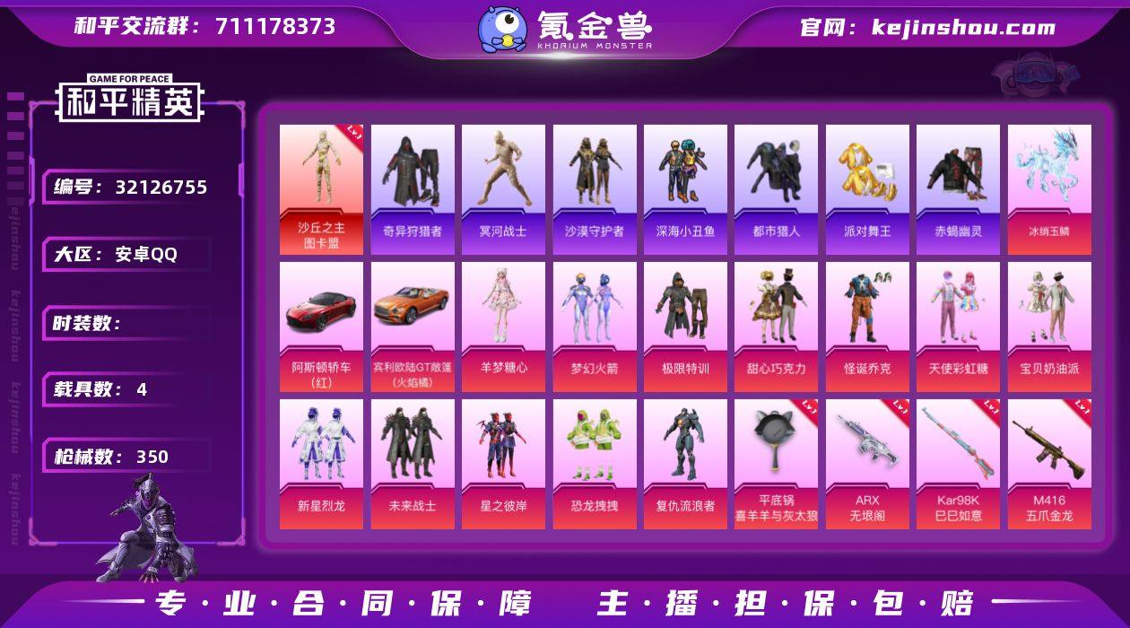 安卓 手Q-4神装-25粉装-21特效枪-12载具-20粉色飞行器-156595热力值-17王牌印记-250套装-372枪皮 【红色载具】:保时捷Panamera(炽焰橙)(二级) 【红色神装等级】:魔童闹海-哪吒(一级),灵猫魔法师-塞维尔(四级),盛世惊鸿-云鸾(一级),幽焰骑士-维塔(一级) 【红色角色神装】:魔童闹海-哪吒,灵猫魔法师-塞维尔,盛世惊鸿-云鸾,幽焰骑士-维塔 【热门品类】:套装-小丑鱼,套装-暗夜行者,套装-龟仙人,套装-粉红小猪,角色-8号机,角色-Mark.06 【粉色套装】:粉装-宝贝奶油派,粉装-彗云及圣,粉装-垂柳戏鸭,粉装-霓裳武神,粉装-彩虹甜喵,粉装-千面幻镜,粉装-暗夜鎏金,角色-小可学妹,角色-幻影,粉装-拂晓神骑,角色-星云暗核,粉装-莲影清波,粉装-暖暖奶龙,角色-圣堂之誓,角色-电波星,套装-创世·救赎,角色-千金淑猫,粉装-雪月幻音,粉装-星穹咏叹调,角色-绯穹魔姬,角色-奇迹舞步 美雪,角色-羊梦糖心,角色-异瞳寒姬,角色-罪夜之冕 【粉色枪皮等级】:AKM-绿萝繁花(五级),AKM-幽焰骑士(三级),AKM-暮色玫影(三级),M16A4-垂柳戏鸭(四级),SCAR-L-锦绣绵绵(五级),SCAR-L-魔童闹海 哪吒(三级),M416-五爪金龙(七级),M416-电玩时刻(五级),M416-灵猫魔法师(三级),AUG-星之彼岸(七级),蜜獾-异瞳寒姬(二级),Famas-天象三御(四级),UMP45-量子极限(五级),Vector-环太平洋(六级),AKS-74U-星穹咏叹调(四级),Kar98K-巳巳如意(五级),M24-莲影清波(四级),MK12-雪月幻音(三级),M249-彩虹甜喵(五级),DP-28-豹影疾电(五级),MG-36-沧焰双生(五级) 【粉色载具】:玛莎拉蒂Ghibli(粉),玛莎拉蒂Grecale(薄荷绿),时空跃影(星辉银),保时捷911 敞篷版(星珀红),保时捷Taycan 旅行版(冰莓粉),保时捷Panamera(炽焰橙),保时捷918 Spyder(沉静蓝),焰龙咆哮,幽焰风驰摩托车,僚机-...