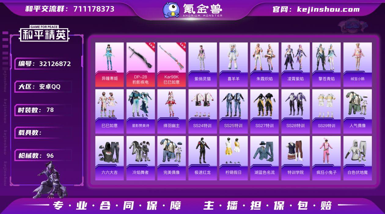 YXc26488-【可二次】【因赛季更新游戏段付以上号为准!】 安卓Q-1粉装4特效枪2热门78套装96枪皮 3印记 历史卓越王牌17星 【1粉装】 异瞳寒姬 【4特效枪】 Kar98K-巳巳如意 (5级) DP-28-豹影疾电 (5级) Mk14-福马献瑞 (4级) UMP45-萌骑冒险 (3级) 【2热门】 破蛋小黄鸡 极速红龙