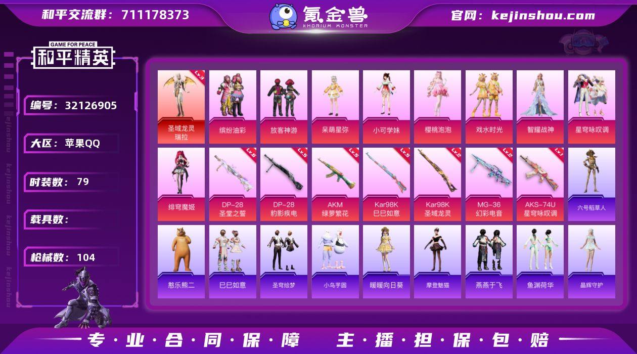 【热门品类】【安卓区封号十年】三级红装 苹果 手Q-1神装-9粉装-7特效枪-0载具-4粉色飞行器-38192热力值-6王牌印记-79套装-104枪皮 【红色神装等级】:圣域龙灵-瑞拉(三级) 【红色角色神装】:圣域龙灵-瑞拉 【热门品类】:粉装-缤纷油彩,角色-六号稻草人 【粉色套装】:粉装-缤纷油彩,粉装-放客神游,角色-呆萌星弥,角色-小可学妹,角色-樱桃泡泡,粉装-戏水时光,角色-智耀战神,粉装-星穹咏叹调,角色-绯穹魔姬 【粉色枪皮等级】:AKM-绿萝繁花(五级),AKS-74U-星穹咏叹调(一级),Kar98K-巳巳如意(五级),Kar98K-圣域龙灵(二级),DP-28-圣堂之誓(六级),DP-28-豹影疾电(五级),MG-36-幻彩电音(二级) 【粉色枪皮】:AKM-绿萝繁花,AKS-74U-星穹咏叹调,Kar98K-巳巳如意,Kar98K-圣域龙灵,DP-28-圣堂之誓,DP-28-豹影疾电,MG-36-幻彩电音 【粉色飞行器】:镜光幻境飞行翼,墨金战记飞行器,圣域金龙飞行器,幻星舰长飞行器 【粉色降落伞】:第五大道降落伞,白勺歌姬降落伞,镜光幻境降落伞,绝色倾城降落伞,樱桃泡泡降落伞,雪月幻音降落伞,圣域龙灵降落伞,智耀战神降落伞,幻海仙踪降落伞,星穹咏叹调降落伞,幻星舰长降落伞,幻彩电音降落伞,荧海星豚降落伞 【稀有套装】:玩偶服-憨乐熊二,套装-巳巳如意,套装-圣穹绘梦,套装-小鸟芋圆,套装-暖暖向日葵,角色-摩登魅猫,套装-燕燕于飞,套装-鱼渊荷华,套装-晶辉守护,角色-糖霜甜心,角色-蜜桃派对,套装-雪夜云雾,套装-晨曦轻云,套装-风舞幻音,套装-萌萌史莱姆,套装-棋盘冕主,套装-粉恋花,套装-紫幽梦,套装-蓝冰羽,角色-猎影月神,角色-瑰梦爱神,角色-六号稻草人,套装-果冻柠檬,角色-鲛海歌灵,套装-星影赞美诗,套装-星渊小夜曲,套装-霓虹热舞,套装-极速光影,套装-云朵鹅,套装-雪绒豹,角色-绛羽幽主 【稀有枪皮】:AKM-破晓战...