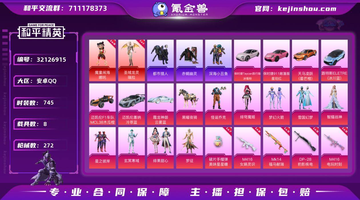 实名:不可二次实名 是否支持人脸包赔:支持 粉装数量:9 特效枪数量:12 载具数:8 时装数:745 枪械数:272 赤蝎幽灵,都市猎人,深海小丑鱼 四级魔童闹海-哪吒,一级圣域龙灵-瑞拉 绯果甜心,绯穹魔姬,怪诞乔克,罗征,梦幻火箭,雪国幻梦,玄冥寒域,星之彼岸,智耀战神 七级破片手榴弹-美味星星糖,六级M416-女娲灵识,五级MK14-福马献瑞,五级DP-28-豹影疾电,五级AUG-暖羊咩咩,五级Kar98K-巳巳如意,五级M416-电玩时刻,五级MK14-甜梦熊击,四级AA12-G-萌骑幻想,三级SCAR-L-魔童闹海 哪吒,三级Kar98K-圣域龙灵,二级信号枪-金乌曜日 保时捷911敞篷版(星珀红),保时捷Taycan旅行版(冰莓粉),黑曜夜骑,路特斯ELETRE(冰川蓝),迈凯伦F1车队 MCL38(木瓜橙),迈凯伦塞纳(冷萃蓝),霜龙神御(云雾蓝),天马凌跃(星芒橙) 狙击之神,会说话的汤姆猫,马上有钱,福马献瑞,红釉青花,SS37特训,雨过天青,青翼流星,雪国风尚,画境星梦,琴音绮想,书海巡游,SS36特训,炫彩糖果,粉黛兰香,萌鸡速递,紫俏灵猫,风迹短诗,秘语星愿,SS35特训,午间小调,元气之梦,漫游都市,懒羊羊,喜羊羊,薄荷星砂,狂鲨锋刃,凌霄紫焰,擎苍青焰,SS34特训套装,朱霞炽焰,Alan Walker电音教主,暗影哥特,冰冻风暴,缤纷果语,白光莹,滨海厨神,白色伏地魔,白熊同盟,彩虹兔,长空猛禽,春日漫步,创世·追猎,赤蝎幽灵,纯真浪花,顶瓜瓜,蝶变,大橘大利,都市猎人,都市魅力,绯格组合,粉红小猪,粉恋花,福星高照,飞行日记,瑰梦爱神,龟仙人,光之冒险,海岛探路者,鹤鸣,虎虎生威吉莉,湖蓝色名流,活力之心,湖畔霞光,幻世保卫者,黑色伏地魔,黄色伏地魔,黄色名流,黄色运动,红色运动,幻世战舞者,湖雨初晴,幻羽潜行,幻影武者,极地朋克,酒红色名流,橘黑制服,娇憨猪猪,竞技达人朋克,竞技角斗士,竞技名士,吉莉礼服,极速光影,极速红龙,街头潮人,街头风暴,金耀舞者,绛羽幽主,空岛之星,狂沙舞者,空投萌叽,蓝冰羽,蓝彩潮人,龙的传人,灵公主,蓝海鲸歌,猎鹰,黎明保卫者,浪漫天命,蓝色运动,龙腾端午,恋语绒绒,冷焰舞者,漫步者,猛禽,萌黄之夏,魅力单车,曼妙人鱼,萌趣咩咩,萌趣颜团子,霓虹街区,柠萌假日,牛气冲天,牛气满满,破蛋小黄鸡,破晓战魂,绮丽涂鸦,青年教官,骑行爱好者,千禧之恋,云朵鹅,荣耀,热情海星,人气偶像,热血青春,深海小丑鱼,深蓝色名流,沙漠兵团,神秘领域,神气赞萌露比,SS14特训,SS15特训,SS16特训,SS17特训,SS18特训,SS19特训,SS20特训,SS21特训,SS22特训,SS23特训,SS24特训,SS25特训,SS26特训,SS27特训,SS28特训,SS29特训,SS30特训套装,SS31特训套装,SS32特训套装,SS33特训套装,巳巳如意,探宝勇士,甜蜜告白,甜蜜熊情侣,特殊使命,特训学院,特种颜团子,特战装甲,完美偶像,王牌教练,炫蓝之夏,雪绒豹,夏日音浪,香桃花海,星渊小夜曲,耀粉歌者,夜瞳黯灵,玉兔迎春,乐音,野性战心,鹰眼刺客,焰鹰斗篷,鱼渊荷华,幽夜迷踪,燕燕于飞,异域银装,战地督导,战地菁英,智谋强哥,紫幽梦,灼焰舞者 炫彩糖果飞行器,灵珠游龙飞行器,提桶跑路飞行器,幻星舰长飞行器,灵猫魔法师飞行器,千面幻镜飞行器,星之彼岸飞行器,绝对恒星降落伞,炫彩糖果降落伞,异瞳寒姬降落伞,魔童闹海 哪吒降落伞,绯穹魔姬降落伞,鬼刀降落伞,幻彩电音降落伞,冷漠罗丽降落伞,灵猫魔