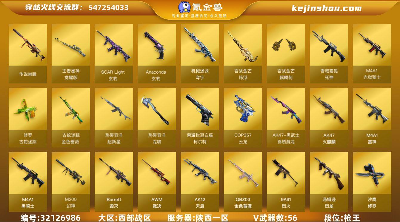陕西一区-55V-6王者武器数-0炫金武器数 【传说武器】:传说幽瞳 【热门武器】:传说幽瞳,QBZ03-金色蔷薇,M200-幻神,柯尔特-荣耀世冠白鲨2023*2,金色蔷薇-古蛇迷踪,修罗-古蛇迷踪,QBZ03-街机,金色小号,C.A.T,牛牛-AK47,M4A1-黑骑士,汤姆逊-烈龙*3,沙鹰-修罗*2,COP 357-极地霜雄 【音效卡】:金色蔷薇-古蛇迷踪音效卡,M4A1-黑骑士音效卡,AWM-裁决音效卡,麒麟刺-百战金芒-盛典舞曲音效卡,炼狱-百战金芒-庆典舞曲音效卡 【皮肤】:金色蔷薇-电竞之星 皮肤,裁决-巅峰荣耀 皮肤,雷神-荣耀之魄,M4A1-再燃火线,火麒麟-平天大圣,火麒麟-心动糖果,火麒麟-傲竹金蛇 皮肤,毁灭-星空,毁灭-英雄计划 皮肤,轻型军用手斧-再燃火线,擎天-冠军之击,擎天-傲竹金蛇 皮肤 【角色】:司雨,零·纪元,战地猎狐,王者涂鸦,雪域霜狐,蛇隐宗,奇洋探员,葵-阿尔法武装,幻面灵狐,炽天使,暗夜-X,飞虎队-X,嘉年华灵狐,兰-海滩派对,猎狐者-追月,零-水下丽影,灵狐者-X,灵狐者-黄金海岸,灵狐者-七夕宝贝,潘多拉-X,潘多拉-甜心教官,蛇姬,斯沃特-X 【人偶武器】:天龙-曼陀罗*2,火麒麟-灵狐,M4A1-雷神-精英刀锋,迷你救赎猎手,街机小灰机,AWM-灵狐-15周年嘉年华,海滩汪汪-巴雷特,C.A.T,牛牛-AK47,迷你生化手雷,M4A1-斯沃特,QBZ03-斯沃特,沙鹰-夜玫瑰 【英雄级武器】:AK47-火麒麟,M4A1-雷神*2,M4A1-黑骑士,AK12-天启,黑武士-锦绣游龙,超新星-热带奇洋,金色蔷薇-古蛇迷踪,死神-雪域霜狐,SCAR Light-玄豹,QBZ03-金色蔷薇,9A91-烈火,AK-47-猩红传说,HK417-朱雀-电竞之星,机械迷城-穹宇,Barrett-毁灭,AWM-裁决,M200-幻神,王者星神-觉醒版,炼狱-百战金芒,汤姆逊-烈龙*3,沙鹰-修罗*2,沙鹰-天神*2,柯尔特-荣耀世冠白鲨2023*2,COP 357-云龙,Anaconda-玄豹,修罗-古蛇迷踪,...