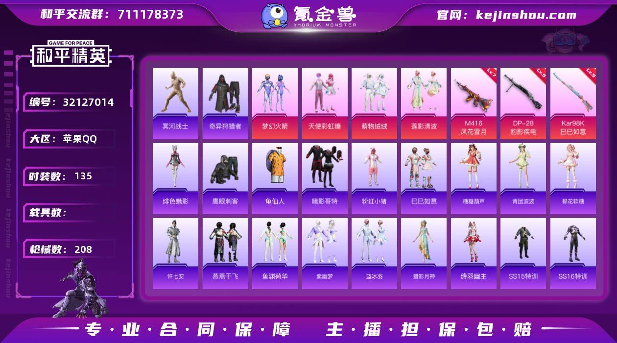 YZJ15550-可二次 苹果Q-2稀有4粉装5特效枪13热门135套装208枪皮 60932热力值 极品精氪追猎对掏号 地铁满天赋 木乃伊 新火箭少女 彩虹糖 莲影清波 萌物绒绒 红眼罩 奇异狩猎者 狂沙 裁决冥王 嘟嘟伙伴 满级M4风花雪月 17印记 历史超级王牌12星 【2稀有】 木乃伊 奇异狩猎者 【4粉装】 梦幻火箭 天使彩虹糖 莲影清波 萌物绒绒 【5特效枪】 Kar98K-巳巳如意 (5级) DP-28-豹影疾电 (5级) M416-风花雪月 (7级) Mk14-福马献瑞 (5级) ACE32-萌骑漫游 (5级) 【13热门】 龟仙人 鹰眼刺客 裁决冥王 暗影哥特 团圆交子 瑞龙福将 纯白誓言 粉红小猪 狂沙舞者 漫步者 破蛋小黄鸡 极速红龙 M762-瑞龙福将 【2头盔】 梦幻火箭头盔 深海小丑鱼头盔 【2背包】 梦幻火箭背包 甜心宝贝背包 营地ID:762981969