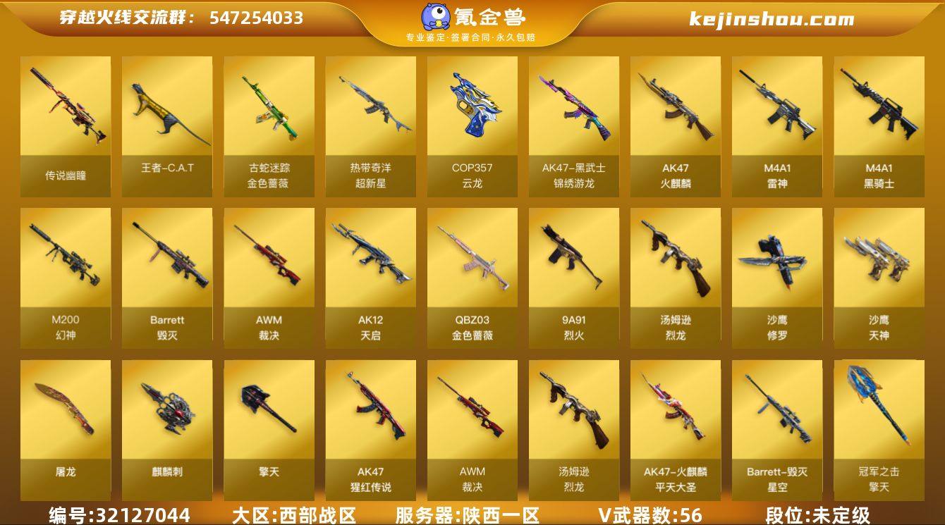 陕西一区-55V-6王者武器数-0炫金武器数 【传说武器】:传说幽瞳 【热门武器】:传说幽瞳,QBZ03-金色蔷薇,M200-幻神,柯尔特-荣耀世冠白鲨2023*2,金色蔷薇-古蛇迷踪,修罗-古蛇迷踪,QBZ03-街机,金色小号,C.A.T,牛牛-AK47,M4A1-黑骑士,汤姆逊-烈龙*3,沙鹰-修罗*2,COP 357-极地霜雄 【音效卡】:金色蔷薇-古蛇迷踪音效卡,M4A1-黑骑士音效卡,AWM-裁决音效卡,麒麟刺-百战金芒-盛典舞曲音效卡,炼狱-百战金芒-庆典舞曲音效卡 【皮肤】:金色蔷薇-电竞之星 皮肤,裁决-巅峰荣耀 皮肤,雷神-荣耀之魄,M4A1-再燃火线,火麒麟-平天大圣,火麒麟-心动糖果,火麒麟-傲竹金蛇 皮肤,毁灭-星空,毁灭-英雄计划 皮肤,轻型军用手斧-再燃火线,擎天-冠军之击,擎天-傲竹金蛇 皮肤 【角色】:司雨,零·纪元,战地猎狐,王者涂鸦,雪域霜狐,蛇隐宗,奇洋探员,葵-阿尔法武装,幻面灵狐,炽天使,暗夜-X,飞虎队-X,嘉年华灵狐,兰-海滩派对,猎狐者-追月,零-水下丽影,灵狐者-X,灵狐者-黄金海岸,灵狐者-七夕宝贝,潘多拉-X,潘多拉-甜心教官,蛇姬,斯沃特-X 【人偶武器】:天龙-曼陀罗*2,火麒麟-灵狐,M4A1-雷神-精英刀锋,迷你救赎猎手,街机小灰机,AWM-灵狐-15周年嘉年华,海滩汪汪-巴雷特,C.A.T,牛牛-AK47,迷你生化手雷,M4A1-斯沃特,QBZ03-斯沃特,沙鹰-夜玫瑰 【英雄级武器】:AK47-火麒麟,M4A1-雷神*2,M4A1-黑骑士,AK12-天启,黑武士-锦绣游龙,超新星-热带奇洋,金色蔷薇-古蛇迷踪,死神-雪域霜狐,SCAR Light-玄豹,QBZ03-金色蔷薇,9A91-烈火,AK-47-猩红传说,HK417-朱雀-电竞之星,机械迷城-穹宇,Barrett-毁灭,AWM-裁决,M200-幻神,王者星神-觉醒版,炼狱-百战金芒,汤姆逊-烈龙*3,沙鹰-修罗*2,沙鹰-天神*2,柯尔特-荣耀世冠白鲨2023*2,COP 357-云龙,Anaconda-玄豹,修罗-古蛇迷踪,...