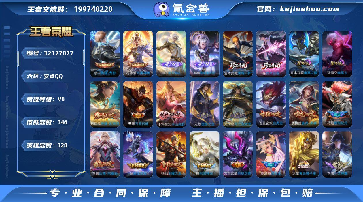 【精品推荐·黛西宝灵宝·鸣剑曳影·九霄神辉·群星魔术团·碎月剑心·黑崎一护·朽木白哉·幽冥之眼·不羡仙天幕·诡秘之主·神骥赴朔漠·祥瑞亨通·马超琥珀纪元·浮生妄·山海炽霜斩·诗剑行·寅虎赤拳·武圣·白虎志·永曜之星·齐天大圣·至尊宝·辉光之辰·山海玄木吟·可二次】YXw18309-安卓Q-128英雄-346皮肤-6王者印记-260铭文-贵族积分9w【贵族8】【2典藏·2无双·2珍品·3星传说·31传说·2天幕·18按键】【因赛季更新游戏段付以上号为准!】 【英雄全皮】:刘禅全皮,元歌全皮,鬼谷子全皮,大司命全皮,敖隐全皮,海诺全皮 【荣耀典藏】:李白鸣剑曳影,花木兰九霄神辉 【无双皮肤】:韩信群星魔术团,李白碎月剑心 【珍品传说】:宫本武藏黑崎一护,暃朽木白哉 【星元皮肤】:宫本武藏幽冥之眼,孙悟空幽冥火,刘备时之思念 【天幕】:不羡仙天幕,共赏芳华天幕 【传说皮肤】:狄仁杰神骥赴朔漠,曹操万灵伏威,干将莫邪千山共赴,元歌诡秘之主,大司命死亡执政官,裴擒虎祥瑞亨通,嬴政玄雷天君,桑启鸣野蒿,马超琥珀纪元,澜逐花归海,张飞百相守梦,夏洛特浮生妄,孙悟空齐天大圣,李信山海炽霜斩,李白诗剑行,马超无双飞将,裴擒虎寅虎赤拳,铠绛天战甲,镜炽阳神光,虞姬启明星使,关羽武圣,曜云鹰飞将,李信一念神魔,刘备时之恋人,干将莫邪久胜战神,达摩黄金狮子座,百里玄策白虎志,杨戬永曜之星,貂蝉仲夏夜之梦,宫本武藏地狱之眼,孙悟空地狱火 【限定皮肤】:姜子牙天穹之誓,杨戬破阵退雄兵,李白谪仙醉月,狄仁杰阴阳师,赵云皇家上将,墨子神迹守卫,嬴政优雅恋人,孙尚香蔷薇恋人,鲁班七号狮舞东方,庄周高山流水,扁鹊奇幻香踪,元歌云间偶戏,元歌无心,甄姬游园惊梦,马可波罗暗影游猎,马可波罗山海玄木吟,狄仁杰魔术师,狄仁杰万华元夜,达摩沙漠行僧,项羽海滩派对,项羽霸王别姬,老夫子醍醐杖,老夫...