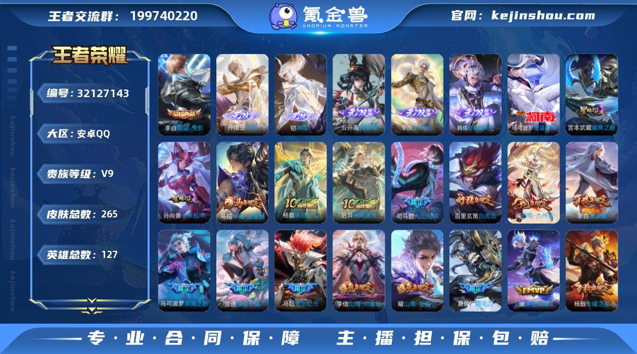 【秒换绑】安卓Q-V9-最强王者段位-127英雄-265皮肤-1典藏皮肤-5无双-1珍品传说-39传说-78史诗 【英雄全皮】:李白全皮,司马懿全皮,孙权全皮 【荣耀典藏】:李白鸣剑曳影 【无双皮肤】:孙悟空无相,铠神罪,公孙离离恨烟,韩信群星魔术团,李白碎月剑心 【珍品传说】:马可波罗怪盗基德 【传说皮肤】:马超神骥逐星野,杨戬纵目迁山,后羿神树通天,司马懿九山相柳,澜愿照九州拓,裴擒虎祥瑞亨通,桑启鸣野蒿,夏侯惇霜北刀,亚连落雪白狼,典韦战鼓燎原,赵云乘龙铭钟鼎,马超琥珀纪元,澜逐花归海,露娜霜月吟,吕布遇见神鼓,马可波罗妄想实况,夏洛特浮生妄,虞姬无限倾心,项羽无限倾心,小乔山海琳琅生,曜山海苍雷引,李信山海炽霜斩,吕布怒海麟威,李白诗剑行,马可波罗深海之息,马超无双飞将,赵云淬星耀世,虞姬启明星使,曜云鹰飞将,刘备时之恋人,干将莫邪久胜战神,达摩黄金狮子座,百里玄策白虎志,花木兰冠军飞将,后羿黄金射手座,杨戬永曜之星,李白凤求凰,孙尚香末日机甲,宫本武藏地狱之眼 【限定皮肤】:公孙离离恨烟,夏侯惇霜北刀,暃埋骨钱,姜子牙天穹之誓,李白谪仙醉月,狄仁杰阴阳师,小乔山海琳琅生,赵云皇家上将,赵云龙胆,阿轲迷踪丽影,吕布遇见神鼓,元歌云间偶戏,元歌无心,夏侯惇朔风刀,典韦岱宗,马可波罗暗影游猎,马可波罗深海之息,马可波罗妄想实况,狄仁杰魔术师,狄仁杰万华元夜,达摩沙漠行僧,项羽海滩派对,项羽无限倾心,老夫子醍醐杖,程咬金演武夺筹,露娜一生所爱,刘邦夺宝奇兵,韩信飞衡,兰陵王金庭之子,孙悟空至尊宝,孙悟空大圣娶亲,后羿辉光之辰,虞姬启明星使,虞姬无限倾心,钟馗驱傩正仪,杨戬永曜之星,雅典娜单词大作战,蔡文姬繁星吟游,鬼谷子原初探秘者,苏烈千军破阵,百里玄策白虎志,百里玄策原初追逐者,弈星混沌棋,明世隐疑决...