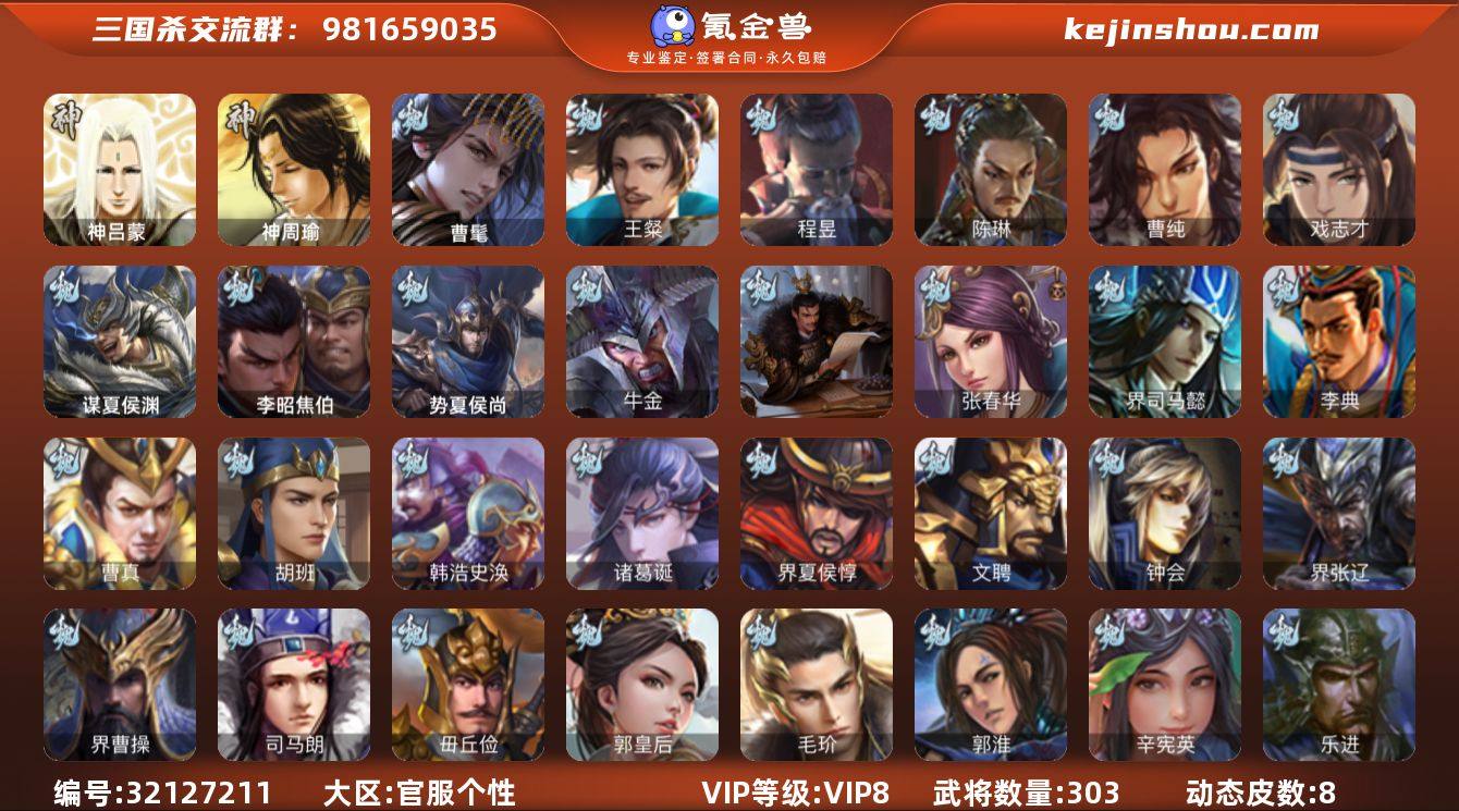 【3342】官阶:骠骑将军;VIP等级:VIP8;史诗武将数量:24;动态皮肤数量:8;武将总数:303;史诗宝珠数量:0;将魂数量:8392;神将:0;魏国史诗武将:6;蜀国史诗武将:7;吴国史诗武将:3;群史诗武将:9 曹髦,王粲,陈琳,曹纯,戏志才,程昱,马云騄,谋赵云,谋马超,赵襄,谯周,花鬘,势魏延,孙皓,界朱然,界徐盛,星黄忠,星甘宁,公孙康,卑弥呼,谋张角,星董卓,兀突骨,司马昭,神吕蒙,神周瑜,势夏侯尚,SP关羽,SP曹仁,SP蔡文姬,乐进,曹昂,诸葛诞,朱灵,文聘,SP姜维,张春华,钟会,曹冲,郭淮,满宠,界王异,界曹操,界司马懿,界夏侯惇,界张辽,界郭嘉,李典,曹真,韩浩史涣,陈群,曹叡,钟繇,司马朗,王基,李通,郭皇后,辛宪英,界甄姬,吕虔,鲁芝,界典韦,界荀彧,毌丘俭,界曹植,界满宠,界郭淮,卞夫人,华歆,蔡贞姬,袁涣,崔琰,毛玠,阮慧,谋于禁,胡班,李昭焦伯,谋夏侯渊,牛金,唐咨,SP孙尚香,夏侯霸,马良,关兴张苞,廖化,界马岱,关平,简雍,刘封,界法正,界关兴张苞,界刘备,界关羽,界张飞,界赵云,界马超,SP徐庶,吴懿,周仓,张松,刘谌,夏侯氏,糜竺,李严,赵统赵广,严颜,界卧龙诸葛,界庞统,界祝融,陈到,界姜维,邓芝,费祎,糜夫人,王甫赵累,界周仓,谋庞统,界张嶷,谋张飞,吴班,诸葛果,界魏延,蒋琬费祎,甘夫人,鲁肃,孙茹,凌操,诸葛恪,诸葛瑾,孙鲁育,程普,韩当,潘璋马忠,虞翻,朱然,界甘宁,界黄盖,界周瑜,界大乔,界陆逊,孙鲁班,朱桓,顾雍,朱治,阚泽,孙登,岑昏,界孙尚香,潘濬,孙亮,严畯,吕岱,周鲂,周妃,界韩当,界虞翻,孙邵,陈武董袭,孙翊,蒋钦,吕范,谋韩当,谋周瑜,界全琮,界朱治,谋小乔,张布,界小乔,孟达,友徐庶,友庞统,伏完,刘协,界袁术,SP赵云,张宝,伏皇后,李儒,界张角,华雄,袁术,界华佗,界吕布,公孙瓒,蔡夫人,公孙渊,郭图逢纪,张鲁,蹋顿,严白虎,刘虞,蔡邕,卢植,刘琦,李傕,界颜良文丑,界袁绍,樊稠,刘繇,界蔡文姬,董承,星徐晃,界公孙瓒,丁原,胡车儿,韩遂,荀谌,羊祜,马...