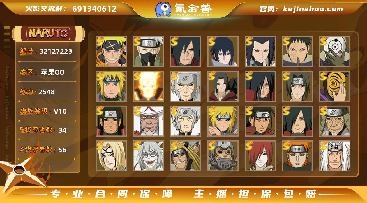 实名: 可修改 贵族等级: V10 S忍数: 34 A忍数: 56 战力值(万): 2548 S级忍者: 千手柱间「秽土转生」,宇智波鼬「秽土转生」,药师兜「仙人模式」,宇智波斑「秽土转生」,半藏「秽土转生」,千手扉间「秽土转生」,纲手「百豪」,波风水门「秽土转生」,金角/银角「秽土转生」,猿飞日斩「秽土转生」,长门「秽土转生」,宇智波斑,千手柱间,艾「四代目雷影」,千手扉间,神秘面具男,佩恩「天道」,大蛇丸,波风水门,纲手,自来也,宇智波鼬 「须佐能乎」,自来也「仙人模式」,猿飞日斩,三代目风影 「秽土转生」,大野木 「忍界大战」,宇智波带土 「忍界大战」,自来也 「舞之豪杰」,宇智波斑「白面具」,漩涡鸣人 「九喇嘛连结」,宇智波佐助「永恒万花筒」,宇智波斑「秽土转生·解」,旗木卡卡西「须佐能乎」,漩涡鸣人·宇智波佐助 亮点: 【优质装备】:千手柱间「秽土转生」,宇智波鼬「秽土转生」,药师兜「仙人模式」,宇智波斑「秽土转生」,半藏「秽土转生」,千手扉间「秽土转生」,纲手「百豪」,波风水门「秽土转生」,金角/银角「秽土转生」,猿飞日斩「秽土转生」,长门「秽土转生」,宇智波斑,千手柱间,艾「四代目雷影」,千手扉间,神秘面具男,三代目风影 「秽土转生」,宇智波带土 「忍界大战」,宇智波斑「白面具」,漩涡鸣人 「九喇嘛连结」,宇智波佐助「永恒万花筒」,宇智波斑「秽土转生·解」,旗木卡卡西「须佐能乎」霸体lv12