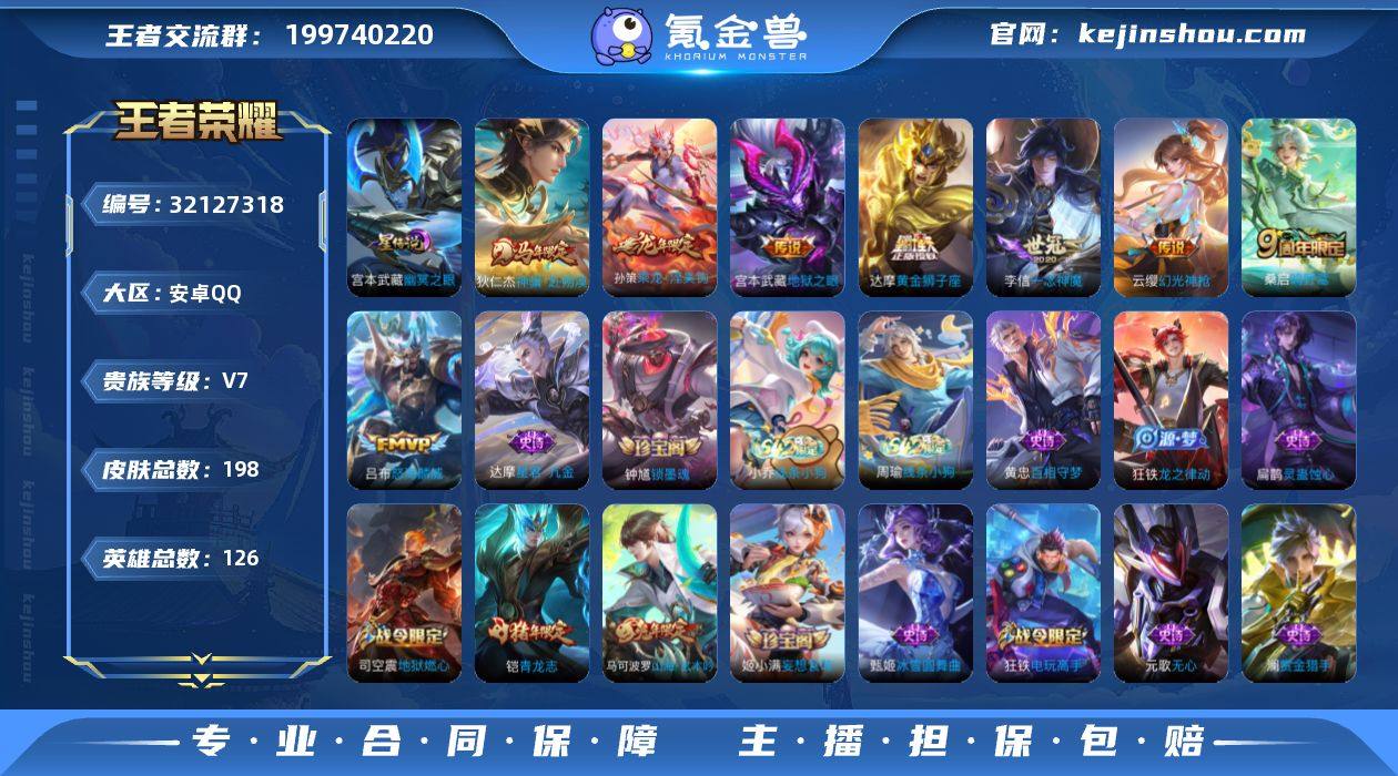 【精品推荐·神骥赴朔漠·乘龙淬吴钩·幽冥之眼·怒海麟威·一念神魔·青龙志·山海玄木吟·可二次】YXw18084-安卓Q-126英雄-198皮肤-8王者印记-203铭文-贵族积分2w【贵族7】【1星传说·8传说·12按键·254幸运值】【因赛季更新游戏段付以上号为准!】 【星元皮肤】:宫本武藏幽冥之眼 【传说皮肤】:狄仁杰神骥赴朔漠,云缨幻光神枪,桑启鸣野蒿,孙策乘龙淬吴钩,吕布怒海麟威,李信一念神魔,达摩黄金狮子座,宫本武藏地狱之眼 【限定皮肤】:姜子牙天穹之誓,杨戬破阵退雄兵,狄仁杰阴阳师,赵云皇家上将,高渐离玩趣恶龙,钟无艳超时空战士,芈月幻夜卜梦,吕布猎兽之王,元歌无心,甄姬落雪兰心,马可波罗山海玄木吟,狄仁杰魔术师,达摩星际陆战队,达摩沙漠行僧,项羽海滩派对,程咬金演武夺筹,王昭君午后时光,兰陵王金庭之子,李元芳云中旅人,钟馗驱傩正仪,鬼谷子五谷丰年,铠青龙志,沈梦溪大漠名商,裴擒虎擒涛扼浪,狂铁电玩高手,云中君纤云弄巧,上官婉儿梁祝,嫦娥拒霜思,嫦娥暖冬兔眠,鲁班大师探海日志,桑启海盐诗旅,暃星界游侠,艾琳流音漫舞,司空震地狱燃心,阿古朵江河有灵,张良古海寻踪,蒙犽百解令,蒙恬荣光圣徽,高渐离燃音魔法,妲己灵卜魔法,鬼谷子天穹祈灯,伽罗琥珀纪元,姬小满妄想食味,孙策乘龙淬吴钩,沈梦溪龙舞盛年,刘邦剑破天穹,程咬金群星魔术团,周瑜熔金海岸 【年限皮肤】:铠青龙志,马可波罗山海玄木吟,孙策乘龙淬吴钩 【赛季限定】:程咬金演武夺筹,钟馗驱傩正仪,达摩沙漠行僧,兰陵王金庭之子,沈梦溪大漠名商,李元芳云中旅人,桑启海盐诗旅,裴擒虎擒涛扼浪,鲁班大师探海日志,张良古海寻踪,鬼谷子天穹祈灯,刘邦剑破天穹,姜子牙天穹之誓,东皇太一噬灭天穹,钟馗虚灵犬护,亚瑟荣光之誓,蒙恬荣光圣徽,牛魔星界战将 【战令限定】:吕布猎兽之王,达摩星际陆...