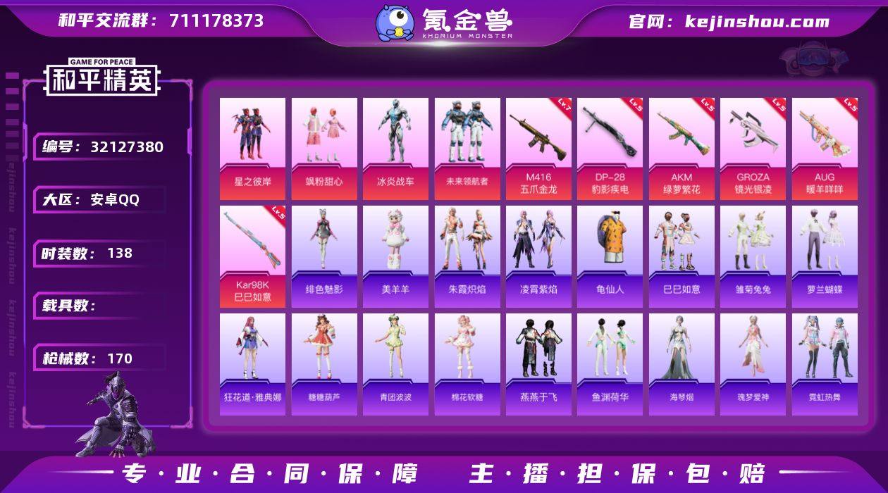 安卓 【小号 粉装-星之彼岸 粉装-飒粉甜心 M416-五爪金龙(七级) AKM-绿萝繁花(五级) DP-28-豹影疾电】手Q-4粉装-6特效枪-0载具-2粉色飞行器-54277热力值-9王牌印记-138套装-170枪皮 【热门品类】:套装-龟仙人 【粉色套装】:粉装-星之彼岸,粉装-飒粉甜心,角色-冰炎战车,粉装-未来领航者 【粉色枪皮等级】:AKM-绿萝繁花(五级),M416-五爪金龙(七级),GROZA-镜光银凌(五级),AUG-暖羊咩咩(五级),Kar98K-巳巳如意(五级),DP-28-豹影疾电(五级) 【粉色枪皮】:AKM-绿萝繁花,M416-五爪金龙,GROZA-镜光银凌,AUG-暖羊咩咩,Kar98K-巳巳如意,DP-28-豹影疾电 【粉色飞行器】:镜光幻境飞行翼 【粉色降落伞】:至尊龙雀降落伞,星之彼岸降落伞,梦之光华降落伞,暗夜鎏金降落伞,第五大道降落伞,纯梦嫁纱降落伞,变形金刚降落伞,莲影清波降落伞,熔岩统帅降落伞,精灵梦叶罗丽降落伞,守护天翼降落伞,忍者神龟降落伞,月影灵韵降落伞,异瞳寒姬降落伞 【稀有套装】:套装-龟仙人,套装-巳巳如意,套装-雏菊兔兔,套装-萝兰蝴蝶,角色-狂花道·雅典娜,套装-糖糖葫芦,套装-青团波波,套装-棉花软糖,套装-燕燕于飞,套装-鱼渊荷华,角色-海琴烟,角色-瑰梦爱神,套装-霓虹热舞,角色-乐音,套装-朱霞炽焰,套装-凌霄紫焰,玩偶服-美羊羊,角色-绯色魅影,套装-炫彩糖果 【稀有枪皮】:AUG-冰晶雪宝,AKM-彩虹符号,AKM-龙的传人,M16A4-蓝色火焰,SCAR-L-红色方程式,M416-糯团青竹,M416-红色方程式,GROZA-彩虹符号,GROZA-影袭,GROZA-懵萌河马,GROZA-田园牧歌,AUG-天降萌叽,AUG-甜蜜菠萝,QBZ-彩虹符号,QBZ-未来歌姬,QBZ-魔药课室,M762-天降萌叽,M762-暗夜鎏金,Mk47-妙红点点,G36C-懵萌河马,G36C-星穹咏叹调,AC-VAL-快闪甜心,蜜獾-天降萌叽,ARX-凌霄紫焰,UZI-啾咪啾咪,UZI-天降萌叽,UMP45-...