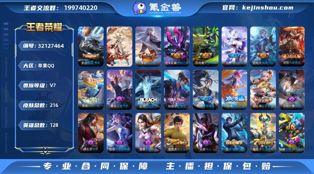 实名: 可修改 性别: 男号 贵族等级: V7 英雄数: 128 皮肤数: 216 荣耀水晶: 鸣剑·曳影 传说皮: 末日机甲-孙尚香,海洋之心,地狱之眼,大乔-时之奇旅 限定皮: 遇见飞天,李小龙,游园惊梦,梁祝,蜜橘之夏,逐梦之音,凤求凰,至尊宝,霸王别姬-虞姬,高山流水,傲雪梅枪,五谷丰年,愿照·九州拓 亮点: 【优质装备】:鸣剑·曳影,末日机甲-孙尚香(绿蚂蚱),海洋之心,地狱之眼,大乔-时之奇旅