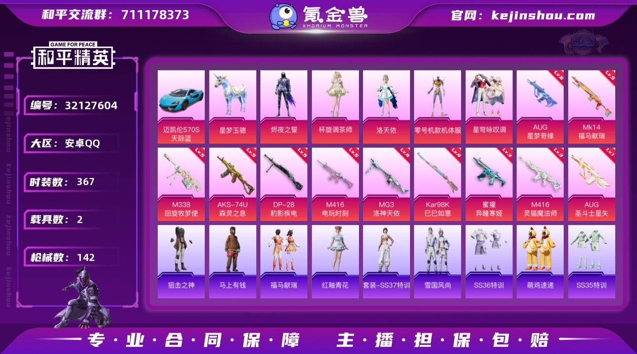 实名: 可修改 时装数: 367 载具数: 2 枪械数: 142 战备数: 85 热门装扮: 呆萌铁蟹,鹰眼刺客,洛天依,零号机款机体服,星穹咏叹调,杯旋调茶师,烬夜之誓 载具: 迈凯伦570S(天际蓝),星梦玉骢 稀有枪皮: MG3洛神天依,M416电玩时刻,AUG星梦奇缘,Kar98K-巳巳如意,AUG-圣斗士星矢,M416-灵猫魔法师,DP-28-豹影疾电,蜜獾-异瞳寒姬,AKS-74U-森灵之息