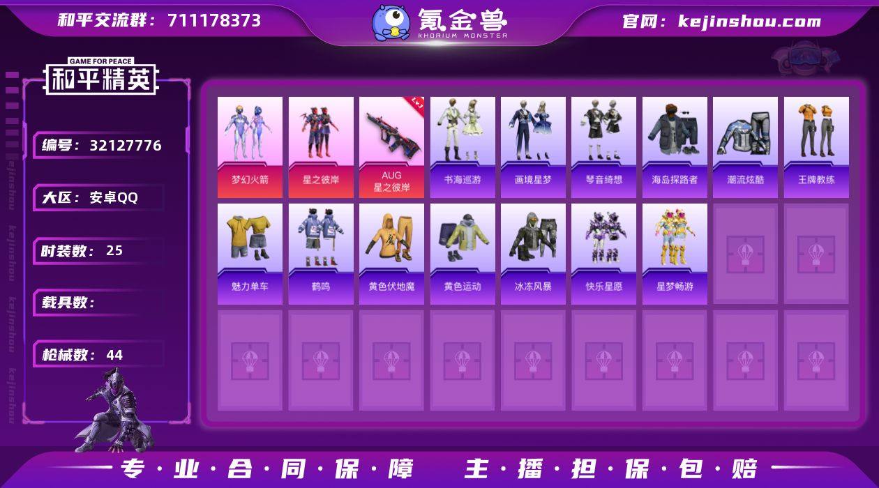 无二次-安卓 手Q-2粉装-5特效枪-0载具-2粉色飞行器-13752热力值-2王牌印记-25套装-44枪皮HZ263707 【热门品类】:粉装-梦幻火箭 【粉色套装】:粉装-梦幻火箭,粉装-星之彼岸 【粉色枪皮等级】:AUG-星之彼岸(一级),AUG-花中眠(三级),UMP45-萌骑冒险(二级),AKS-74U-森灵之息(五级),Mk14-福马献瑞(五级) 【粉色枪皮】:AUG-星之彼岸,AUG-花中眠,UMP45-萌骑冒险,AKS-74U-森灵之息,Mk14-福马献瑞 【粉色飞行器】:香车宝马飞行器 【粉色降落伞】:幻影战神降落伞,梦幻火箭降落伞,星之彼岸降落伞,罪夜之冕降落伞,天马神君降落伞 【稀有套装】:套装-马上有钱,套装-书海巡游,套装-画境星梦,套装-琴音绮想,角色-月烬之祷,套装-雨过天青,套装-红釉青花 【稀有枪皮】:AKM-星之彼岸,SCAR-L-夜灯,M416-糯团青竹,AUG-幻影战神,蜜獾-天降萌叽,ACE32-画境星梦,UZI-炫彩节奏,UMP45-夜灯,Vector-彩虹符号,MP5K-画境星梦,Kar98K-梦幻火箭,VSS-星之彼岸,Mini14-梦幻火箭,M1加兰德-画境星梦,S12K-夜灯,AA12-G-画境星梦,M249-星之彼岸,爆炸猎弓-花中眠,平底锅-画境星梦 【其他套装】:套装-海岛探路者,套装-潮流炫酷,套装-王牌教练,套装-魅力单车,套装-鹤鸣,套装-黄色伏地魔,套装-黄色运动,套装-冰冻风暴,套装-快乐星愿,套装-星梦畅游 【稀有头盔】:梦幻火箭头盔(3级),梦幻火箭头盔(2级),梦幻火箭头盔(1级),幻影战神头盔(1级) 【稀有背包】:梦幻火箭背包(3级),梦幻火箭背包(2级),梦幻火箭背包(1级) 【营地ID】:1039684386
