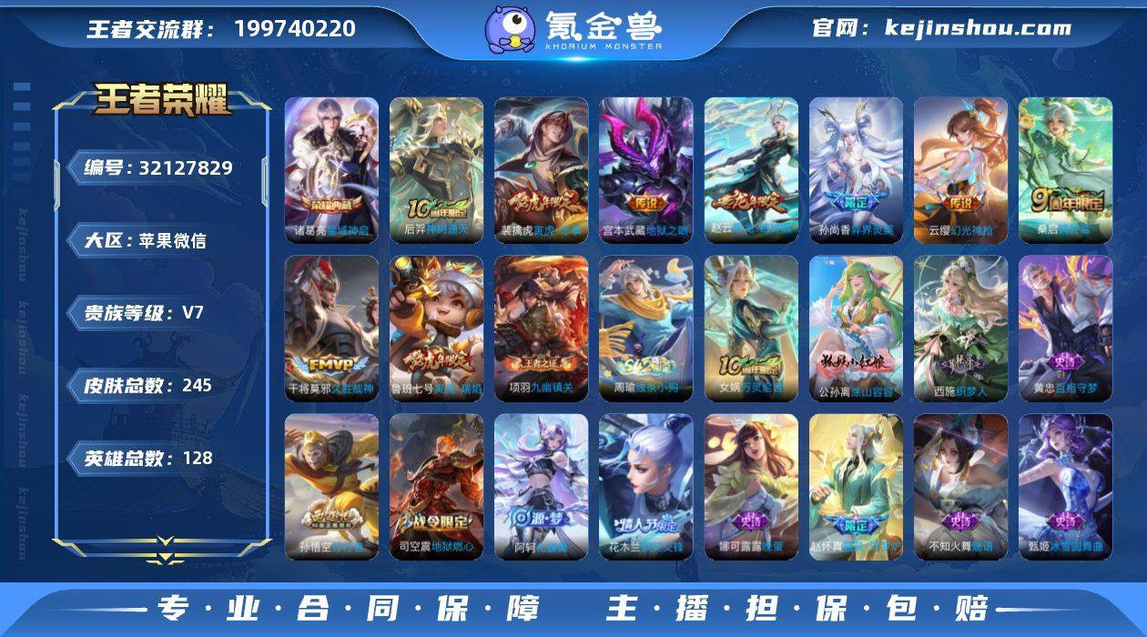 实名: 可修改 性别: 男号 贵族等级: V7 英雄数: 128 皮肤数: 245 荣耀水晶: 星域神启 传说皮: 久胜战神,地狱之眼,乘龙·铭钟鼎,幻光神枪,神树通天 限定皮: 遇见飞天,李小龙,梁祝,异界灵契-孙尚香,默契交锋-花木兰,寅虎·瑞焰,高山流水,孙行者,寅虎·赤拳,五谷丰年,鸣野蒿 亮点: 【优质装备】:星域神启(倪克斯贼亮),久胜战神,地狱之眼,涂山容容