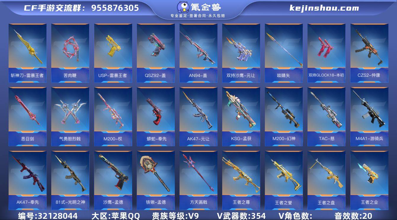 B653059 【极品V9-5至尊2同框-66王者-紫电王力-冠军EP王幻-帝皇侠+无双手环-满屏三国套-6烈龙+蝴蝶-冰霜最终消灭-卡牌大师拆弹动画-多王者多三国多万化-全模式开花-详情看图-价格可议】 王者V武器数量66 英雄武器数量354 音效卡数量20 万化数量662 VIP等级【文本】VIP9级 狙击枪线数量7 消灭音效数量10 游戏等级158 【传奇】 【不支持】 【是】 【可排位】 三国系列21 三国系列:AK47-奉先,AK47-孟德,AK47-元让,M4A1-星象,M4A1-仲达,蟒蛇-奉先,沙鹰-孟德,铁锹-孟德,双持沙鹰-元让,啖睛矢,苦肉鞭,QSZ92-盖,方天画戟,CZS2-仲康,M200-权,TAC-慈,气勇胆烈戟,VEPR12-本初,双持GLOCK18-本初,思召剑,KSG-孟获;
