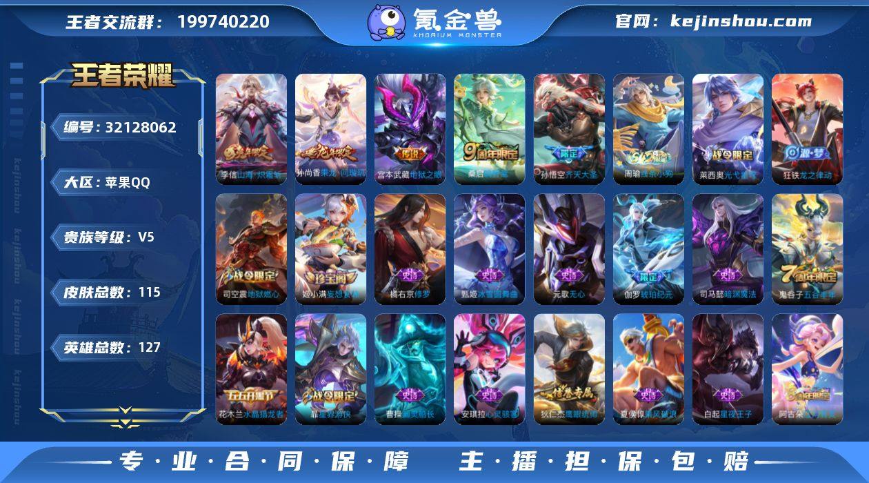 实名: 可修改 性别: 男号 贵族等级: V5 英雄数: 127 皮肤数: 115 传说皮: 地狱之眼,山海·炽霜斩,乘龙·问璇玑 限定皮: 游园惊梦,五谷丰年,齐天大圣,鸣野蒿 亮点: 【优质装备】:地狱之眼,山海·炽霜斩(李信年限)