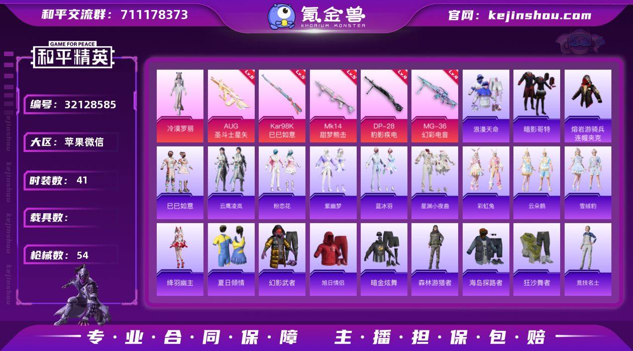 【mhp1173】苹果 微信-1粉装-5特效枪-0载具-0粉色飞行器-15740热力值-2王牌印记-41套装-54枪皮 【热门品类】:套装-浪漫天命,套装-暗影哥特,熔岩游骑兵连帽夹克 【粉色套装】:角色-冷漠罗丽 【粉色枪皮等级】:AUG-圣斗士星矢(六级),Kar98K-巳巳如意(五级),Mk14-甜梦熊击(五级),DP-28-豹影疾电(四级),MG-36-幻彩电音(四级) 【粉色枪皮】:AUG-圣斗士星矢,Kar98K-巳巳如意,Mk14-甜梦熊击,DP-28-豹影疾电,MG-36-幻彩电音 【粉色降落伞】:智耀战神降落伞,炫彩糖果降落伞 【稀有套装】:套装-巳巳如意,套装-云鹰凌岚,套装-粉恋花,套装-紫幽梦,套装-蓝冰羽,套装-星渊小夜曲,套装-彩虹兔,套装-云朵鹅,套装-雪绒豹,角色-绛羽幽主 【稀有枪皮】:SCAR-L-夜灯,SCAR-L-炫彩节奏,M416-蓝色火焰,AUG-耀粉歌者,M762-云朵鹅,AC-VAL-天降萌叽,UMP45-生命誓言,UMP45-蓝色火焰,P90-巳巳如意,M24-幻彩电音,Mini14-耀粉歌者,SVD-云朵鹅,S686-巳巳如意,DBS-幻彩电音,SPAS-12-云朵鹅,M249-破晓战魂,短管霰弹-星穹咏叹调,沙漠之鹰-云朵鹅,TMP-9-萌萌史莱姆,大砍刀-云朵鹅,撬棍-冷漠罗丽,破片手榴弹-巳巳如意 【其他套装】:套装-夏日倾情,套装-幻影武者,套装-旭日情侣,套装-暗影哥特,套装-暗金炫舞,套装-森林游猎者,套装-浪漫天命,套装-海岛探路者,套装-狂沙舞者,套装-竞技名士,套装-绮丽涂鸦,套装-绯格组合,套装-缤纷果语,套装-长空猛禽,套装-魅力单车 【稀有背包】:萌熊伴侣背包(3级),萌熊伴侣背包(2级),萌熊伴侣背包(1级),深海小丑鱼背包(1级) 【营地ID】:940410815