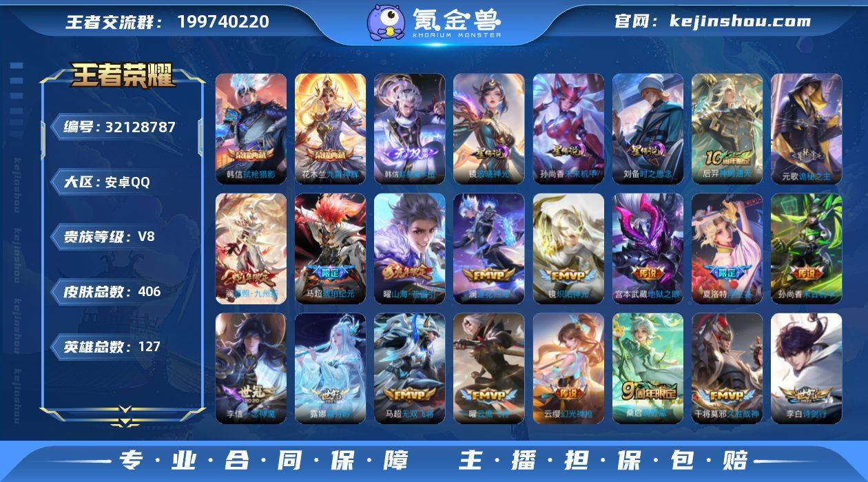 贵族等级:V8 典藏皮肤数:2 珍品无双皮肤数:0 无双皮肤数:1 珍品传说皮肤数:0 传说皮肤数:27 史诗皮肤数:113 皮肤数:406 英雄数:127 段位:王者 卖家说:金标巅峰打野,3个万战巅峰头像框上赛季2100