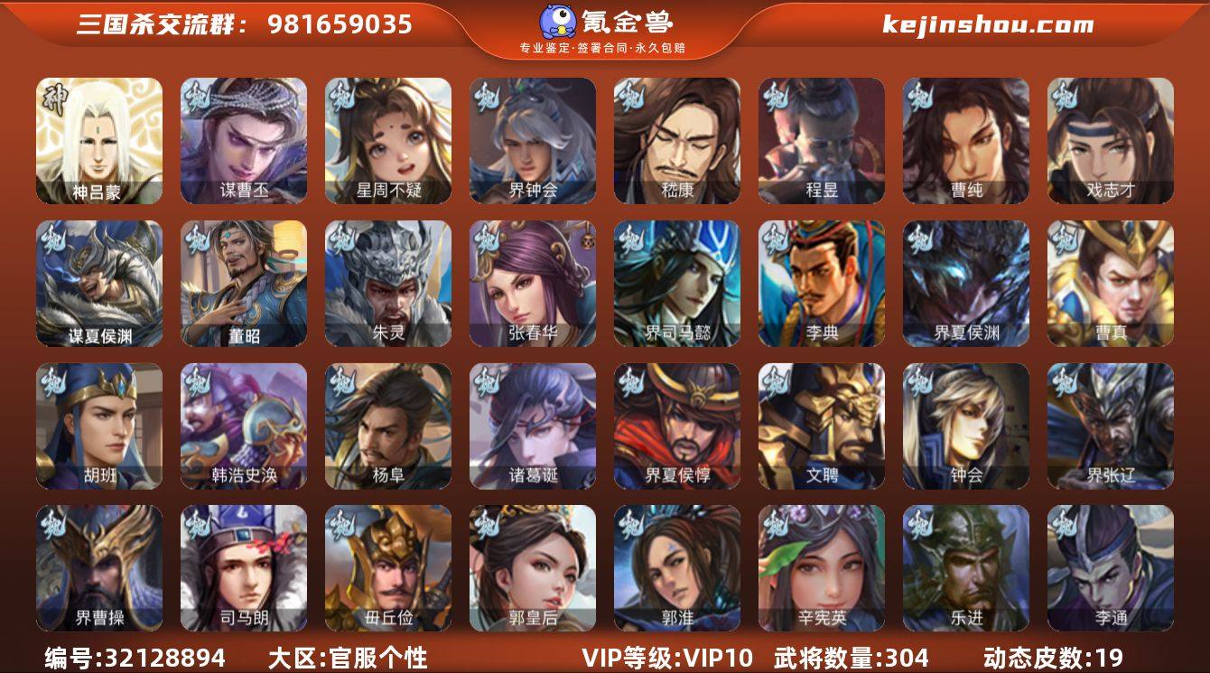 官阶: 骠骑将军 VIP等级: VIP10 武将数量: 304 动态皮肤数量: 19 神将: 神吕蒙 魏国武将: 戏志才,曹纯,程昱,嵇康,界钟会,张辽,SP蔡文姬,SP关羽,SP贾诩,SP姜维,卞夫人,曹昂,曹操,曹冲,曹洪,曹丕,曹仁,曹叡,王异,张恭,鲁芝,界满宠,界曹植,满宠,王基,钟繇,郭嘉,荀彧,阮慧,界郭嘉,界曹丕,界荀彧,朱灵,界甄姬,吕虔,界王异,界许褚,界郭淮,华歆,陈群,界曹休,袁涣,李通,乐进,辛宪英,郭淮,郭皇后,毌丘俭,夏侯惇,曹植,司马朗,界曹操,星周不疑,许褚,界张辽,谋徐晃,张郃,钟会,文聘,曹彰,界夏侯惇,诸葛诞,司马懿,甄姬,杨阜,徐晃,韩浩史涣,胡班,曹真,谋曹丕,典韦,界夏侯渊,夏侯渊,李典,于禁,邓艾,界司马懿,张春华,朱灵(国战),董昭,谋夏侯渊 蜀国武将: 关索,花鬘,谯周,沙摩柯,谋赵云,徐庶,界魏延,杨仪,界关羽,界诸葛亮,邓芝,界伊籍,费祎,严颜,界黄月英,界张嶷,赵云,张松,彭羕,李丰,界刘备,界刘禅,谋姜维,刘封,糜竺,蒋琬,谋庞统,黄月英,刘巴,关羽,王甫赵累,吴懿,界廖化,向宠,祝融,张飞,黄皓,魏延,界周仓,界法正,刘禅,界赵云,张翼,关银屏,界祝融,SP孙尚香,SP徐庶,卧龙诸葛,周仓,简雍,界关兴张苞,诸葛亮,法正,界简雍,界马岱,关平,马岱,界庞统,庞统,诸葛果,谋张飞,马谡,马超,廖化,关兴张苞,孟获,秦宓,吴苋,姜维,黄忠,刘备,界马超,李严,马良,蒋琬费祎,刘谌,彭羕(国战),甘夫人,蜀-糜芳傅士仁,SP甘夫人 吴国武将: 界徐盛,留赞,吴景,周处,潘濬,周泰,吕蒙,诸葛恪,界孙尚香,丁奉,谋吕蒙,孙茹,薛综,蒋钦,顾雍,界朱治,孙休,严畯,界孙权,孙翊,祖茂,濮阳兴,界虞翻,界吕蒙,界孙策,凌操,朱治,徐氏,孙尚香,程普,大乔,韩当,陆逊,诸葛瑾,朱然,吕范,太史慈,虞翻,界黄盖,孙鲁班,界周瑜,孙权,谋小乔,鲁肃,界甘宁,吴国太,甘宁,界大乔,孙坚,孙鲁育,凌统,岑昏,周瑜,小乔,潘璋马忠,黄盖,吕岱,孙策,界陆逊,界周泰,界吴国太,徐盛,张昭张纮,陈武蕫袭,界张昭张纮...