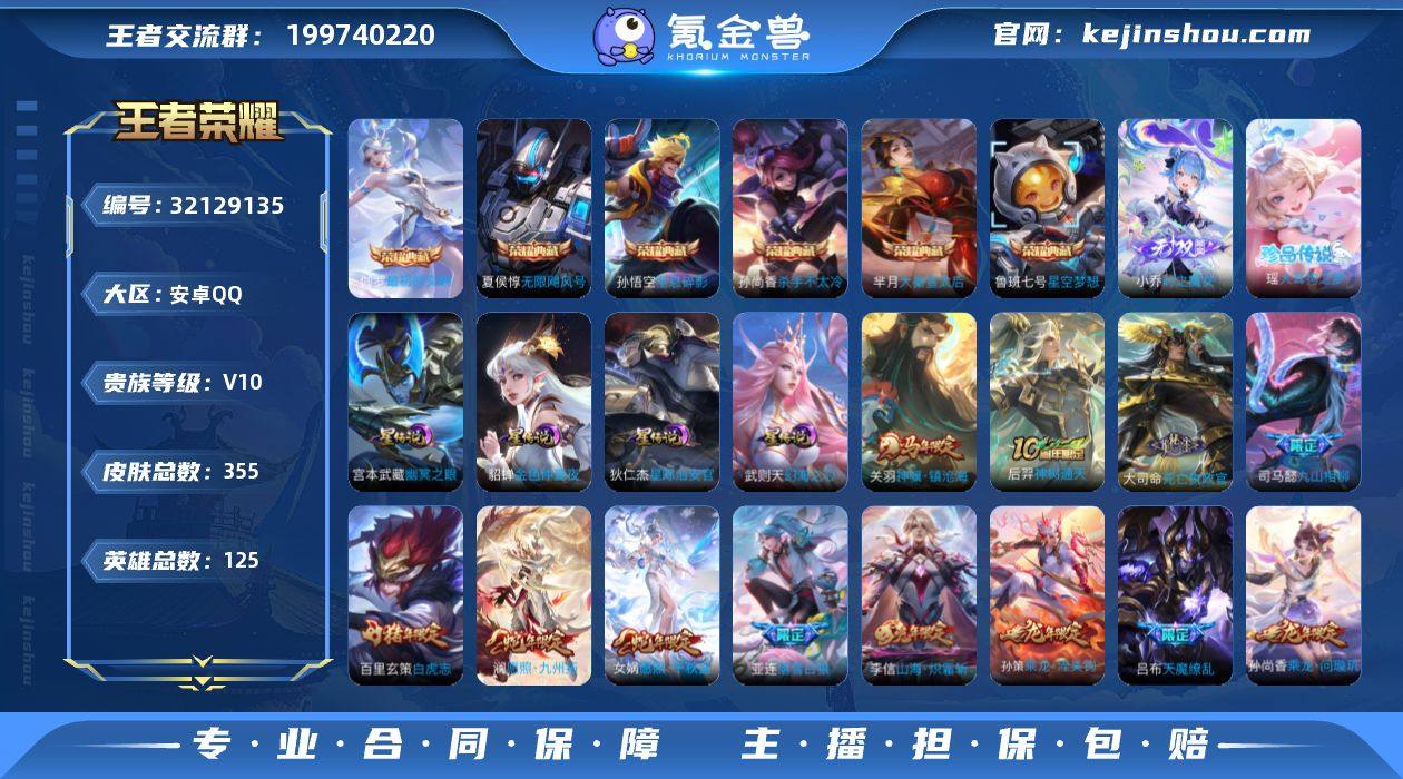 【aswz1625】安卓Q-V10-尊贵铂金I段位-125英雄-355皮肤-6典藏皮肤-1典藏英雄-1无双-1珍品传说-40传说-117史诗 【英雄全皮】:苏烈全皮,阿古朵全皮,夏洛特全皮,戈娅全皮,影全皮 【荣耀典藏】:武则天英雄,孙悟空全息碎影,夏侯惇无限飓风号,孙尚香杀手不太冷,鲁班七号星空梦想,芈月大秦宣太后,伽罗最初的交响 【无双皮肤】:小乔时之魔女 【珍品传说】:瑶大耳狗之梦 【传说皮肤】:关羽神骥镇沧海,后羿神树通天,大司命死亡执政官,司马懿九山相柳,女娲愿照千秋盛,澜愿照九州拓,云缨幻光神枪,桑启鸣野蒿,云中君群星魔术团,亚连落雪白狼,孙尚香乘龙问璇玑,孙策乘龙淬吴钩,赵云乘龙铭钟鼎,艾琳觅芳踪,吕布遇见神鼓,马可波罗妄想实况,夏洛特浮生妄,孙悟空齐天大圣,李信山海炽霜斩,吕布怒海麟威,马超无双飞将,蔡文姬花朝如约,赵云淬星耀世,诸葛亮时雨天司,镜炽阳神光,虞姬启明星使,曜云鹰飞将,刘备时之恋人,张良黄金白羊座,虞姬云霓雀翎,达摩黄金狮子座,百里玄策白虎志,花木兰冠军飞将,梦奇胖达荣荣,后羿黄金射手座,貂蝉仲夏夜之梦,宫本武藏地狱之眼,吕布天魔缭乱,武则天海洋之心,狄仁杰超时空战士 【限定皮肤】:蔡文姬夏日便利店,虞姬夏日便利店,姜子牙天穹之誓,李白谪仙醉月,狄仁杰阴阳师,赵云皇家上将,墨子神迹守卫,嬴政白昼王子,鲁班七号狮舞东方,庄周高山流水,芈月白晶晶,吕布天魔缭乱,吕布猎兽之王,吕布遇见神鼓,周瑜赤莲之焰,元歌云间偶戏,元歌无心,夏侯惇朔风刀,典韦蓝屏警告,马可波罗妄想实况,狄仁杰魔术师,狄仁杰万华元夜,达摩星际陆战队,达摩沙漠行僧,项羽海滩派对,老夫子醍醐杖,安琪拉魔法小厨娘,程咬金演武夺筹,露娜一生所爱,兰陵王驯魔猎人,兰陵王金庭之子,花木兰瑞麟志,孙悟空大圣娶亲,孙悟空齐天大圣,牛魔御旌,李...