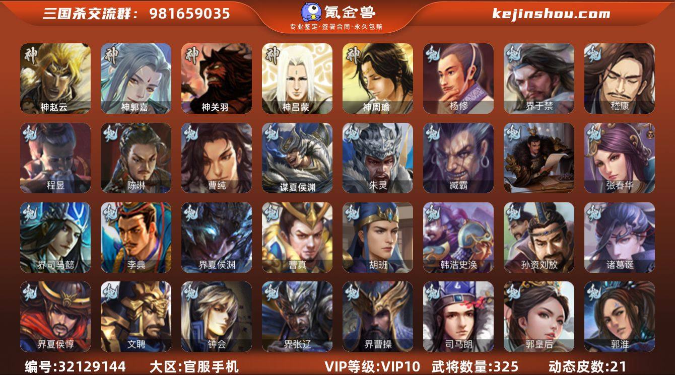 官阶: 骠骑将军 VIP等级: VIP10 武将数量: 325 动态皮肤数量: 21 神将: 神郭嘉,神赵云,神关羽,神吕蒙,神周瑜 魏国武将: 曹纯,陈琳,程昱,嵇康,界于禁,杨修,唐咨-魏,张辽,SP蔡文姬,SP曹仁,SP关羽,SP贾诩,SP姜维,SP庞德,卞夫人,曹昂,曹操,曹冲,曹洪,曹丕,曹仁,曹叡,曹嵩,王异,鲁芝,界满宠,曹休,界曹植,满宠,荀攸,王基,钟繇,蒯越蒯良,郭嘉,荀彧,杜畿,界郭嘉,崔琰,界荀彧,朱灵,界甄姬,界王异,界许褚,华歆,陈群,界邓艾,界典韦,界曹休,袁涣,李通,乐进,郭淮,郭皇后,夏侯惇,曹植,司马朗,界曹操,许褚,界张辽,谋徐晃,张郃,钟会,文聘,曹彰,界夏侯惇,诸葛诞,司马懿,甄姬,徐晃,孙资刘放,韩浩史涣,胡班,曹真,典韦,界夏侯渊,夏侯渊,李典,于禁,邓艾,界司马懿,张春华,孟达-魏,臧霸,朱灵(国战),谋夏侯渊 蜀国武将: 董允,花鬘,谯周,沙摩柯,谋马超,谋赵云,徐庶,杨仪,吕凯,界关羽,界诸葛亮,邓芝,界伊籍,费祎,界黄月英,界张嶷,赵云,张松,彭羕,李丰,界刘备,刘封,糜竺,李遗,谋庞统,黄月英,刘巴,关羽,王甫赵累,吴懿,吴班,祝融,张飞,黄皓,魏延,界周仓,界法正,糜夫人,界孟获,刘禅,界赵云,张翼,界祝融,SP孙尚香,SP徐庶,卧龙诸葛,宗预,周仓,简雍,界关兴张苞,诸葛亮,界张飞,界卧龙诸葛,法正,界简雍,赵统赵广,界马岱,关平,马岱,界庞统,庞统,诸葛果,谋张飞,马谡,马超,廖化,关兴张苞,孟获,夏侯氏,姜维,黄忠,刘备,界马超,李严,马良,傅肜,蒋琬费祎,刘谌,彭羕(国战),甘夫人,蜀-糜芳傅士仁 吴国武将: 贺齐,界徐盛,留赞,周泰,全琮,吕蒙,诸葛恪,界孙尚香,界顾雍,大乔小乔,丁奉,谋吕蒙,周鲂,孙茹,顾雍,阚泽,孙亮,界朱治,孙休,严畯,界孙权,界孙休,界凌统,祖茂,濮阳兴,界吕蒙,孙登,凌操,朱治,谋黄盖,孙尚香,程普,大乔,韩当,陆逊,诸葛瑾,朱然,太史慈,虞翻,界黄盖,孙鲁班,界周瑜,卫温诸葛直,孙权,谋小乔,鲁肃,界甘宁,界韩当,吴国太,甘宁,界大乔,孙坚,孙鲁育,凌统...
